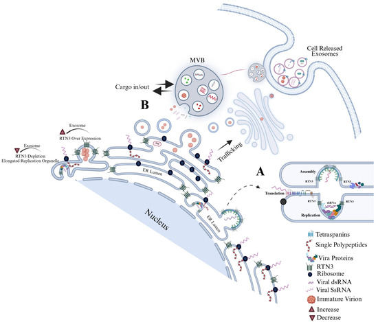 Dengue virus manipulates the endoplasmic reticulum (ER) landscape through the short Reticulon-3 isoform (RTN3S) to generate infectious exosomes. Following DENV entry, positive-strand genomic RNA is translated on rough ER membranes. RTN3S (dark green hairpin elements) accumulates at the peri-nuclear ER and sculpts it into bulb-like invaginations toward the ER lumen. These curved subdomains recruit ribosomes (navy spheres), newly synthesized viral polyprotein (dashed red coils), and non-structural replication factors (-colored icons), forming sealed single-membrane vesicle packets that entrap double-stranded replicative DENV RNA (magenta helices). (A) Magnified inset in the graphic highlights how RTN3S helices directly clasp dsDENV RNA, creating a selective ribonucleoprotein scaffold that favors viral, over cellular, cargo. (B) Viral particles bud from the ER and converge with early endosomes to seed multivesicular bodies (MVBs). Inside the maturing MVB, they become intraluminal vesicles destined to leave the cell as exosomes. A bold “cargo in/out” arrow at the MVB boundary mirrors RTN3S’s dual role: it both guides viral material into the endosomal lumen and licenses its export once the MVB fuses with the plasma membrane. The released exosomes are depicted dispersing from the cell, each carrying replication-competent DENV RNA, non-structural proteins, and occasional immature virions, an immune-evasive inoculum primed for cell-to-cell spread. Modulating RTN3S levels alters every step in this pathway. RTN3S over-expression (upper left) intensifies ER curvature, increases the number of replication organelles, and drives a surge in cargo-rich exosome release. Conversely, RTN3S depletion (lower left) yields elongated, poorly scissioned replication tubules, drastically reduces vesicle trafficking to MVBs, and suppresses exosome output. These opposing phenotypes, annotated directly on the schematic, underscore RTN3S as a gatekeeper that links flavivirus RNA replication to selective exosome biogenesis and extracellular dissemination.