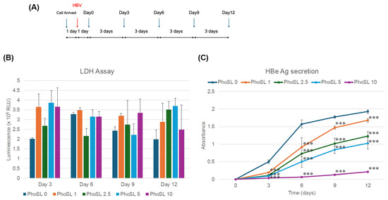 PhoSL inhibits the infection and replication of HBV in normal hepatocytes (PXB cells). (A) This figure shows an overview of the concentration-dependent experiments of PhoSL cotreatment during HBV infection. The blue arrow indicates the day of medium replacement, and the red arrow indicates the day of HBV infection. PhoSL was co-administered at various concentrations at the time of infection. (B) Cell viability of PXB cells cultured with PhoSL for 3, 6, 9, or 12 days is shown. PhoSL concentrations of 0, 1, 2.5, 5, and 10 μg/mL are shown in dark blue, orange, dark green, light blue, and magenta, respectively. Viable cells were measured by LDH-Glo cytotoxicity assay. No statistically significant differences were observed between 1, 2.5, 5, and 10 μg/mL PhoSL and 0 μg/mL PhoSL. Error bars indicate standard deviation; n = 3. (C) Time course of HBeAg production after treatment with various concentrations of PhoSL during HBV infection. Each data point is shown with the mean value +/− S.D. *** p < 0.001.