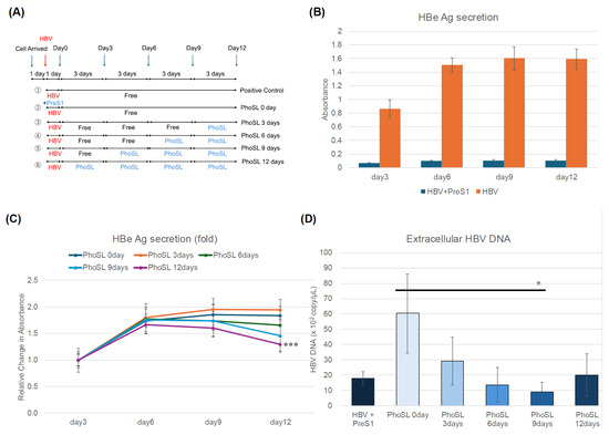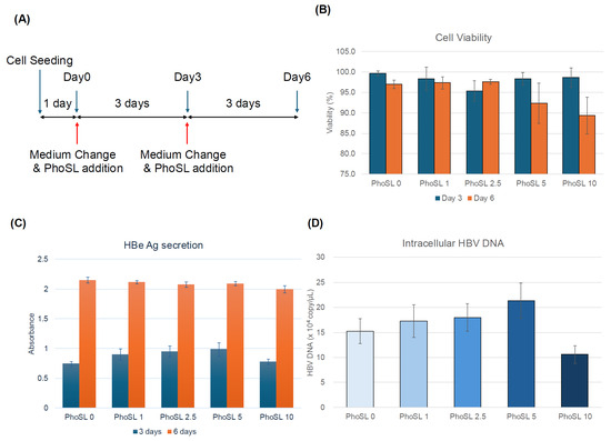 HBV stocks were prepared as previously described [35]. PXB cells (4 × 105/well) seeded in 24-well plates were replaced with 0.5 mL of fresh medium once upon arrival, and HBV infection experiments were started the next day or later. The cells were infected with HBV (2 × 107 genomes/well [approximately 50 genome infectious equivalents (G.E.I)]) in a medium containing 4% polyethylene glycol 8000 (PEG 8000 [Sigma-Aldrich]). After 24 h of incubation, the cells were washed twice with 0.5 mL of PBS and cultured for 12 days in 0.5 mL of the same medium, with the medium changed every 3 days. Culture supernatants were collected five times, on the day of medium replacement and at the end of incubation, and hepatitis B e antigen (HBeAg) was quantified by using an HBeAg ELISA kit (Bioneovan, Beijing, China). For a positive control, pattern 1 was used, in which myrPS1 was co-administered at a final concentration of 1 µM for 1 day at the time of HBV infection. PhoSL was administered at a final concentration of 10 µg/mL in the following four patterns: (1) administration for 12 days after a medium change following the end of HBV infection; (2) administration for the final 9 days of culture, (3) administration for the final 6 days of culture, and (4) administration for the final 3 days of culture.