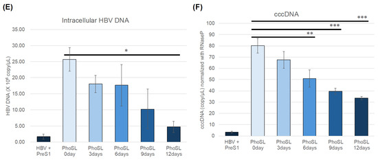 To verify the feasibility of PhoSL therapy for patients with HBV infection, we used PXB cells to examine whether the administration of PhoSL after HBV infection has an infection-suppressing effect, using changes in HBe Ag production and extracellular HBV production as indicators. As shown in the results in Figure 2C, it was found that PhoSL can suppress HBe Ag production in a treatment time-dependent manner, even when administered after HBV infection. This result is almost reflected in the results in Figure 2D, and it was confirmed that the amount of extracellular HBV DNA was also suppressed with increasing PhoSL treatment time.