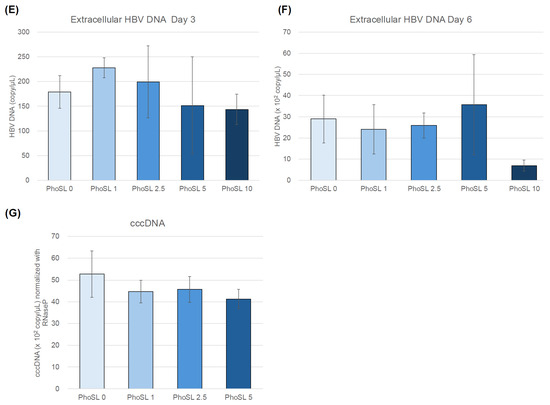 As shown in Figure 1C, PhoSL was able to suppress HBe antigen production in normal hepatocytes in a concentration-dependent manner, as well as in hepatocellular carcinoma cells. The results in Figure 1C show that the effect of PhoSL coexistence during HBV infection was large, and HBeAg production was dramatically suppressed during the measurement period from the third day after the end of infection. This is thought to be due to PhoSL’s strong inhibition of HBV intracellular entry.