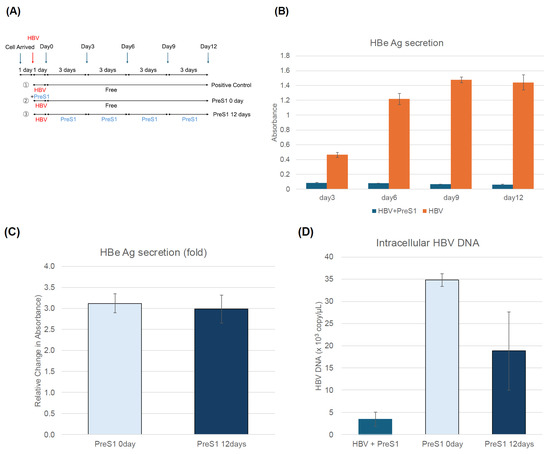 Figure 2A outlines an experiment in which PhoSL was administered therapeutically after HBV infection. Cells were infected with HBV for 1 day, washed twice with PBS, and then cultured in the presence of PhoSL for 3, 6, 9, or 12 days. Figure 2B shows the time course of HBe Ag produced in the culture supernatant after HBV infection. When myristoylated PreS1 peptide (myrPreS1) coexisted during HBV infection, the infection was strongly suppressed, and HBe Ag production in the medium was low even after 12 days.