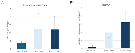 HepAD38.7 cells are a tetracycline-regulated HBV-producing cell line that use the Tet-Off system. To obtain HBV particles for HBV infection experiments, tetracycline was removed from the culture medium and HBV replication was induced in HepAD38.7 cells. The culture medium of confluent HepAD38.7 cells cultured without tetracycline was collected every week for 2 weeks, and HBV particles were precipitated by adding PEG 8000 (final concentration 6%) and allowing it to stand overnight at 4 °C. The precipitate was centrifuged, resuspended in phosphate-buffered saline (PBS), concentrated, and filtered through a 0.45 µm filter (Millipore, Burlington, MA, USA). HBV DNA was quantified by qPCR and adjusted to 107 HBV/µL.