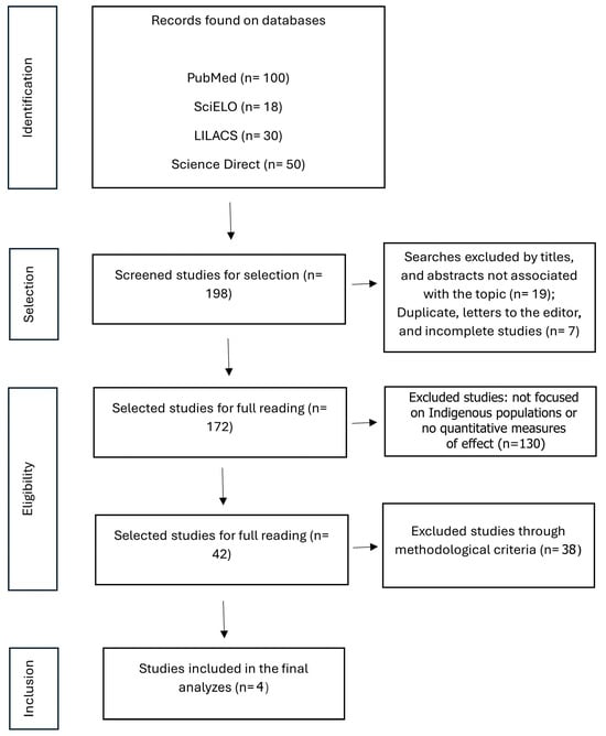 Another important dimension revealed by this review concerns the methodological quality of the included studies. The greatest consistency of findings was observed in studies classified as high-quality, which demonstrated greater coherence between objectives and methods, as well as relevance for public policymaking []. On the other hand, lower-quality studies presented flaws in bias control and population definition. These findings point to the urgent need for investment in robust, longitudinally structured research that considers the specificities of Indigenous peoples from methodological design to analysis and feedback.