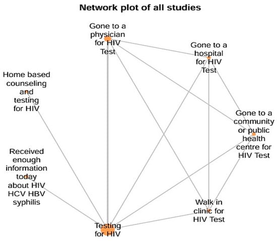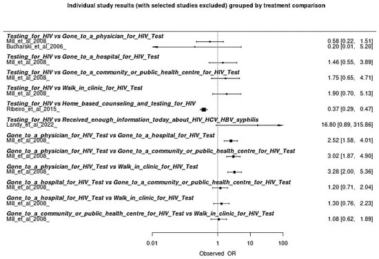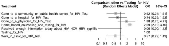 Figure 4 details the effects of the interventions compared to HIV testing alone, acting as the reference intervention. The findings showed that home counseling and testing showed a statistically significant superior effect compared to testing alone, with a confidence interval that does not cross the null line (OR > 1), indicating statistically significant greater effectiveness. Visiting a doctor for testing also showed better performance compared to testing alone, although with a smaller effect size. Strategies such as visiting hospitals or public/community clinics did not show statistically significant differences compared to testing alone—suggesting that the location and format of the intervention directly impact its effectiveness. The intervention “Receiving information about STIs” had the lowest relative effectiveness, with odds ratios close to or below neutrality, indicating low effectiveness alone.