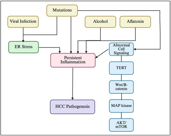 - Alcohol-related HCC is driven by ethanol metabolism into acetaldehyde, which causes oxidative stress and ROS accumulation, promoting DNA damage and carcinogenesis [44]. Additional mechanisms include gut-derived endotoxin-induced inflammation via TLR4 activation, IL-1β-mediated inflammasome signaling, and genetic variants in ADH, ALDH, PNPLA3, TM6SF2, and MBOAT7 that enhance susceptibility to ALD and HCC [45,46,47,48].