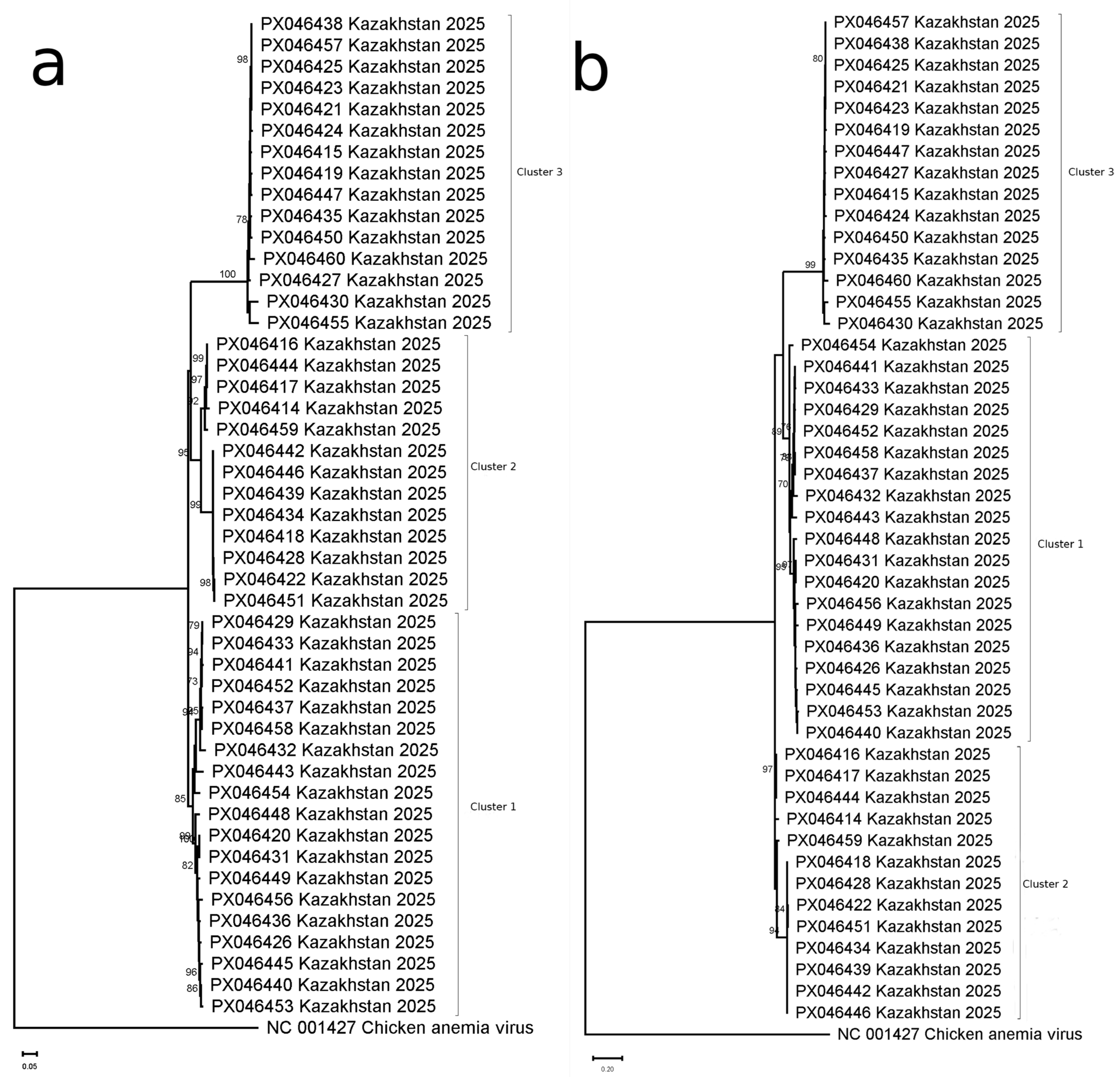Phylogenetic analysis of nucleotide sequences (n = 47) identified three major clusters comprising 35 genetic variants (Figure 1a, Table S1), with maximum inter-cluster divergence of 18.0%. Cluster-specific divergence levels were 5.9% (Cluster 1), 6.4% (Cluster 2), and 4.9% (Cluster 3), with ORF1 lengths of 1311 bp (Clusters 1–2) and 1302 bp (Cluster 3).