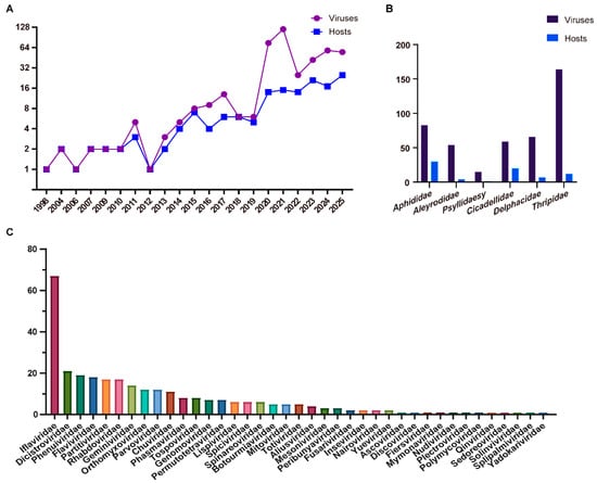 Diversity of viruses in piercing-sucking insects. (A) The increasing number of viruses and piercing-sucking insect hosts from 1998 to 2025. (B) The distribution of viruses in piercing-sucking insect hosts species across different families. (C) The number of viruses belonging to different families.