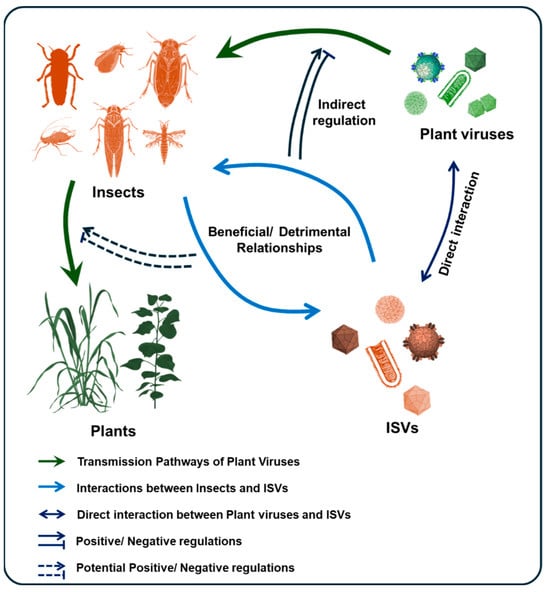 The efficacy of plant virus transmission differs among various insect populations. ISVs represent a significant category of symbiotic microorganisms in insects, and the diversity of viruses in insects is influenced by factors such as population, season, weather conditions, and geographical location [11,13,18]. These newly identified viral sequences provide exceptional prospects for investigating virus–host coevolution and interactions, with potential implications for manipulating insect traits. Given that most ISVs specifically infect insects, they serve as promising tools for managing both insect vectors and the pathogens they transmit—whether utilized as wild-type agents or engineered recombinants. This review focuses on ISVs, examining the interplay between plant viruses and vector insects, the discovery and functional roles of ISVs, and the potential application of ISVs in mitigating plant viral infections.