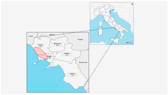 The Annual Programming Document (DPAR) of the Campania Region—concerning official controls in the field of urban veterinary hygiene and animal management—defines and plans inspection, sampling, and surveillance activities to be carried out annually by territorial veterinary units. Within the DPAR, there is a mandatory activity whereby at least 5% of the dogs and cats found dead in the regional territory must undergo necropsy (carried out by the Zooprofilactic Experimental Institute of Southern Italy, IZSM) to ascertain the cause of death. Consequently, between 2021 and 2023 a total of 131 animal carcasses (51 dogs and 80 cats) were submitted to IZSM for necropsy. For each animal, background information, including age, sex, lifestyle, and geographical location, was recorded from the animals’ clinical history, although no data regarding clinical signs observed in life were available. Number of animals collected per province and area, including municipalities with the highest MIEP scores, is indicated in Figure 1. During necropsy, carried out by veterinarians and laboratory technicians, anatomopathological lesions compatible with infectious diseases were documented. Furthermore, within the CoV-Diox project, a small piece of each organ (lungs, liver, spleen, intestine) was sampled and investigated, via molecular assays, to evaluate the presence of CoV RNA. Moreover, in a subset of 32 liver samples (14 from dogs and 18 from cats), the concentration of 17 PCDD/F, 12 DL-PCB and 6 NDL-PCB congeners was determined.