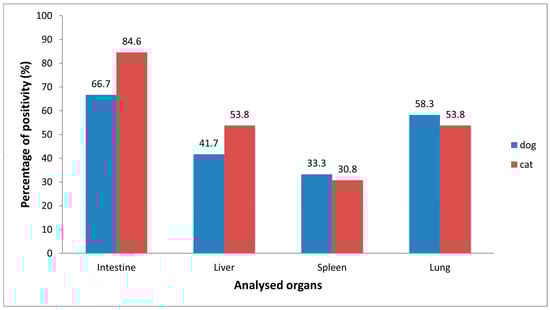 Coronavirus prevalence (%) in organs of animals (dogs and cats) found to be infected.
