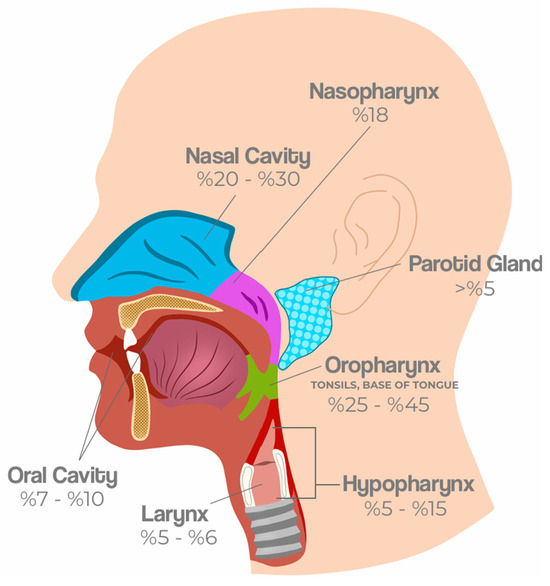 Anatomical distribution and prevalence of HPV-related HNCs. HPV-related HNCs most frequently arise in the oropharynx, particularly the tonsils and base of the tongue (25−45%). Other affected subsites include the oral cavity (7−10%), nasopharynx (18%), larynx (5−6%), hypopharynx (5–15%), nasal cavity (20–30%), and parotid gland (>5%). These patterns reflect both regional epidemiological variation and distinct biological predispositions of lymphoid-rich tissues to HPV-driven carcinogenesis [1,13,14,15].