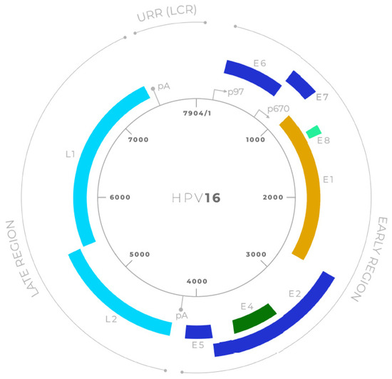 Schematic representation of the HPV16 genome organization [26]. The circular double-stranded DNA genome of Human Papillomavirus type 16 (HPV16; 7904 bp) is shown, divided into early (E) and late (L) regions. Early genes include E6, E7, E1, E2, E4, E5, and E8, which are involved in viral replication, transcriptional regulation, and oncogenesis. Late genes L1 and L2 encode the major and minor capsid proteins, respectively. The upstream regulatory region (URR; also known as the long control region, LCR) contains the viral origin of replication and transcriptional control elements. Major promoters (p97, p670) and polyadenylation sites (pA) are indicated.