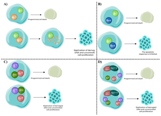 Oncogenic functions of HPV E6 and E7 oncoproteins in host cells [45]. (A) E6–p53 interaction: In normal conditions, p53 induces programmed cell death in response to DNA damage. HPV E6 binds to p53 and promotes its ubiquitination and degradation, preventing apoptosis and enabling replication of damaged DNA. (B) E6–Bax interaction: Bax, a pro-apoptotic protein, normally promotes apoptosis. Binding of E6 to Bax inhibits its function, blocking the apoptotic response and supporting uncontrolled cell survival. (C) E7–Rb interaction: Retinoblastoma protein (Rb) sequesters E2F transcription factors to prevent inappropriate cell cycle progression. HPV E7 binding inactivates Rb, releasing E2F and driving expression of S-phase genes, resulting in uncontrolled proliferation. (D) E7–CDK inhibitors interaction: Cyclin-dependent kinase inhibitors p21 and p27 normally block the Cyclin D–CDK4/6 complex, enforcing the G1/S checkpoint. HPV E7 inhibits p21 and p27, removing this control and further accelerating cell cycle progression and replication of damaged DNA.