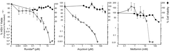 The effects of Ruvidar®, acyclovir, and metformin on Vero cell viability and HSV-1 yields. Vero cells were treated with the indicated concentrations of drugs for 72 h to measure cell viability, or cells were pre-treated for 4 h with the indicated drug concentrations, infected with HSV-1 at MOI ~0.01, incubated in the presence of the same drug concentrations as pre-treatment for 68 h, and virus yields were determined. Error bars represent the standard error of the means (SEMs) from at least three replicates.