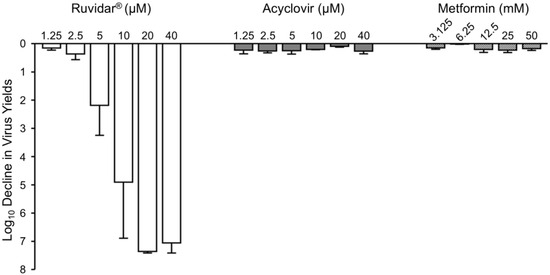 Effects of Ruvidar®, acyclovir, and metformin on HSV-1 yields when added 24 hpi. Vero cells were infected with HSV-1 at MOI ~ 1.5, incubated for 24 h, then treated at 24 hpi with the indicated concentrations of drugs for an additional 44 h. Virus yields were then determined, and reductions in virus yields were compared to non-treated controls. Error bars represent SEMs from at least three replicates.