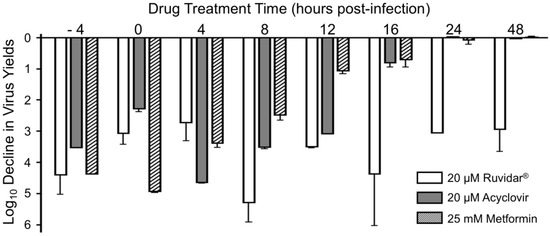 Effects of Ruvidar®, acyclovir, and metformin on HSV-1 yields when added at various times pre- and post-infection. Vero cells were infected with HSV-1 at MOI ~ 1.5 and treated at indicated times with the indicated concentrations of drugs. Virus yields were determined at 68 hpi, and reductions in virus yields were compared to non-treated controls. Error bars represent SEMs from at least three replicates.