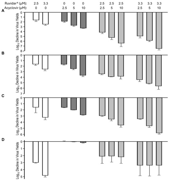 The effects of Ruvidar® in combination with acyclovir on HSV-1 yields when added at various times pre- and post-infection. Vero cells were infected with HSV-1 at MOI ~ 1.5 and treated at (A) 4 h pre-infection; (B) at the same time as infection; (C) 8 hpi; or (D) 24 hpi with indicated concentrations of drugs. Virus yields were determined at 68 hpi, and reductions in virus yields were compared to non-treated controls. Error bars represent SEM from at least three replicates.