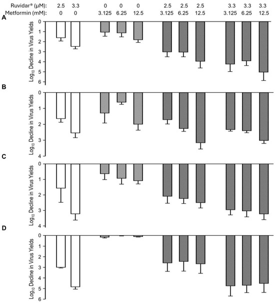 Combinations of Ruvidar® and metformin are shown in Figure 5. When used alone and when added 4 h pre-infection, 2.5 and 3.3 µM Ruvidar® inhibited HSV-1 replication ~1.5 and ~2.5 Log10, respectively (Figure 5A, left-most white bars). Similarly, when used alone and when added 4 h pre-infection, 3.125, 6.5 and 12.5 mM metformin inhibited HSV-1 replication ~1.1, ~1.2, and ~1.8 Log10, respectively (Figure 5A, cross-hatched bars). When used in combination, most doses had a slightly additive effect (Figure 5A, right-most light gray cross-hatched bars). The combination of Ruvidar® with metformin in most cases had additive effects on HSV-1 replication inhibition when added at the same time as the infection was initiated (Figure 5B) or if 2.5 µM Ruvidar® was added 8 hpi (Figure 5C); however, if 3.3 µM Ruvidar® was added 8 hpi, or combinational drugs were added 24 hpi, the inhibition of HSV-1 replication was less effective than if Ruvidar® was used alone (Figure 5C,D).
