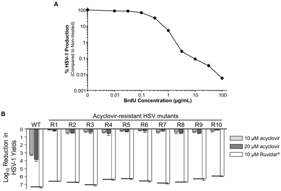 A major problem with HSV-1 anti-viral therapy is that acyclovir-resistant mutants can commonly develop. To test the anti-viral effects of Ruvidar® on such mutants (HSVAc-R), we passaged HSV-1 in the presence of increasing concentrations of acyclovir. We initially determined the concentration of 5′-Bromo-2′-deoxyuridine (BrdU) required to reduce viral progeny production 1–2 Log10, conditions reported to favor mutant production [18,25]. Addition of 1 μg/mL of BrdU resulted in ~5% HSV-1 production compared to that in non-drug-treated samples (Figure 6A).