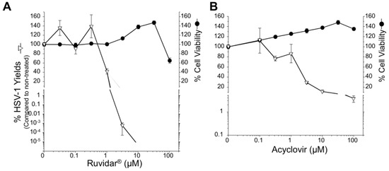 All previous work had been performed in monkey kidney Vero cells. Astrocytes are another cell type that can be infected by several herpesviruses, including HSV-1 [26,27]. To test whether these drugs could also inhibit HSV-1 in this more relevant cell type, we initially pre-treated human U251 glioblastoma astrocytoma cells with different concentrations of acyclovir or Ruvidar® and determined cell viabilities and the capacity of WT HSV-1 to replicate (Figure 7). Cell viability remained >50% at all tested Ruvidar® concentrations, and wild-type HSV-1 yields were reduced >10,000-fold by 3.16 μM Ruvidar® (Figure 7A). Cell viability also was unaffected by any tested acyclovir concentration up to 100 μM and HSV-1 yields were reduced ~10-fold at 10 μM acyclovir and ~25-fold at 100 μM (Figure 7B).