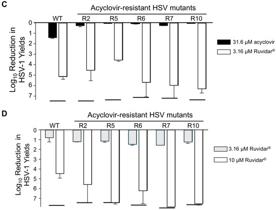 WT HSV-1 grew to almost 3 × 108 PFU/mL, and growth was inhibited 10-fold by 3.16 μM Ruvidar® and 47,000-fold by 10 μM Ruvidar®, respectively, even when added 24 h after infection had started. The various HSVAc-R mutants grew to ~1 × 108 PFU/mL in U251 cells in the absence of drugs, were inhibited >14-fold by 3.16 μM Ruvidar®, and were inhibited >13,000,000-fold by 10 μM Ruvidar®, indicating that therapeutic application of Ruvidar® remained effective, even against acyclovir-resistant HSV-1.