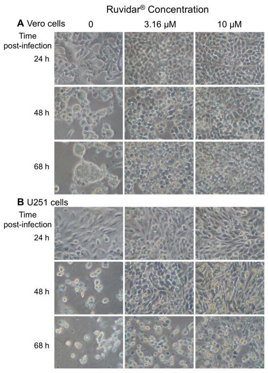 To determine if Ruvidar® application would affect the HSV-1-induced cytopathic effect (CPE), we pre-treated both types of cells with 0, 3.16, or 10 μM Ruvidar®, infected with HSV-1 at MOI 1.5, and monitored cell morphology over time (Figure 8). HSV-1 infection induced a small amount of CPE in non-drug-treated cells by 24 hpi in both cell types, and there was substantial CPE in both non-drug-treated cells by 48 hpi. By contrast, there was little, if any, CPE in both cell types treated with either drug concentration by 48 hpi. There also was little, if any, CPE in the Vero cells treated with either drug concentration by 68 hpi. U251 cells showed stress in both drug concentrations by 68 hpi.