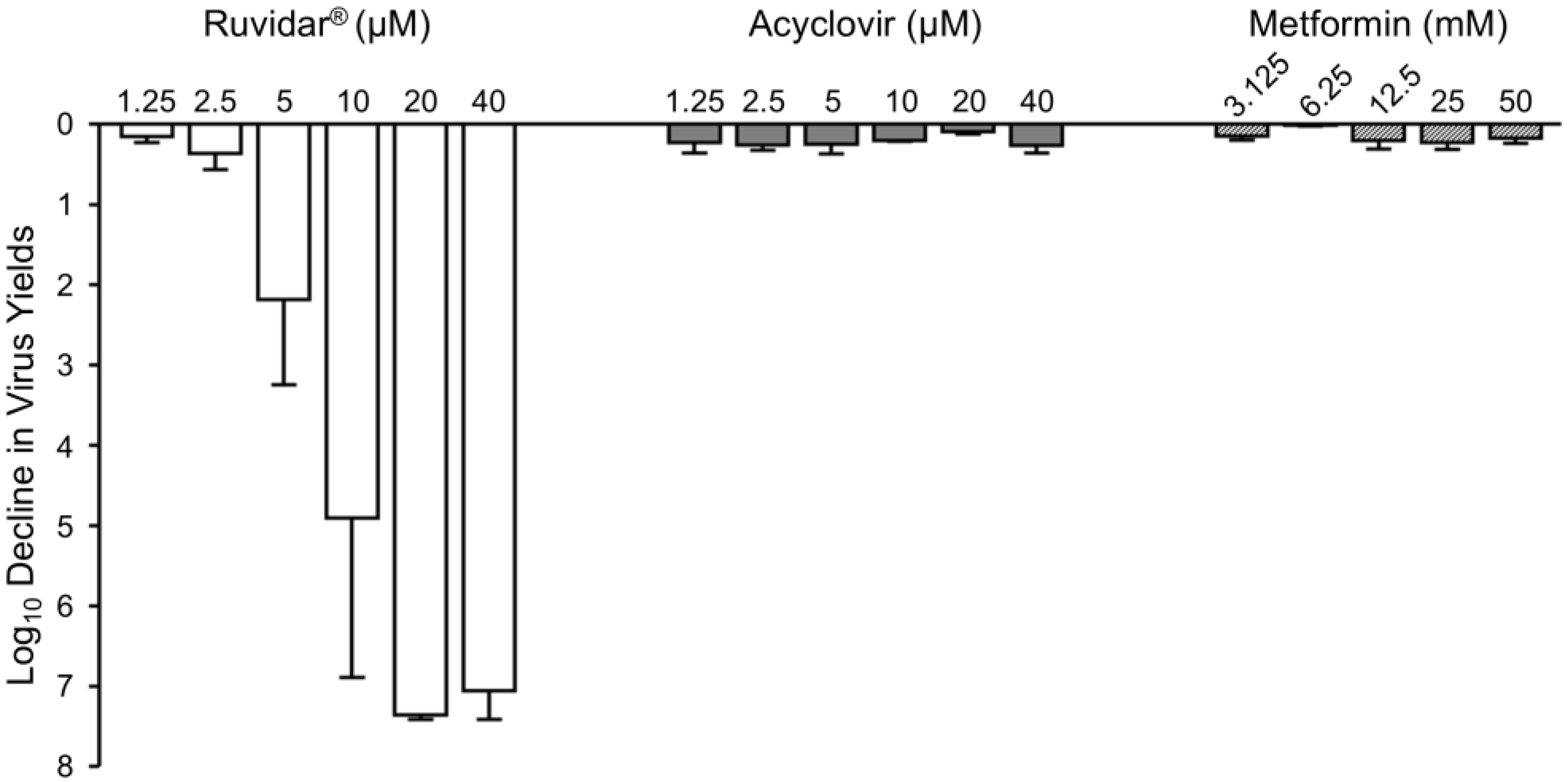 3.1. Ruvidar®, Acyclovir, and Metformin All Demonstrate Anti-HSV-1 Activity When Used Prophylactically