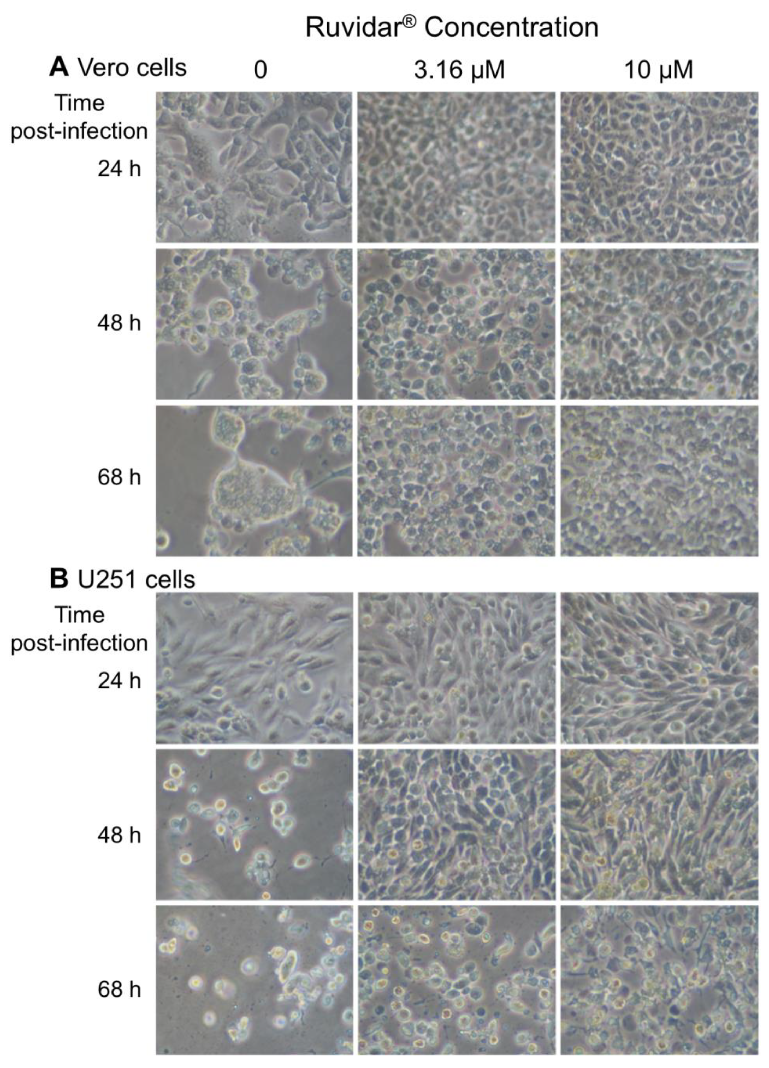 3.6. Ruvidar® Protects HSV-1-Infected Cells from Cytopathology