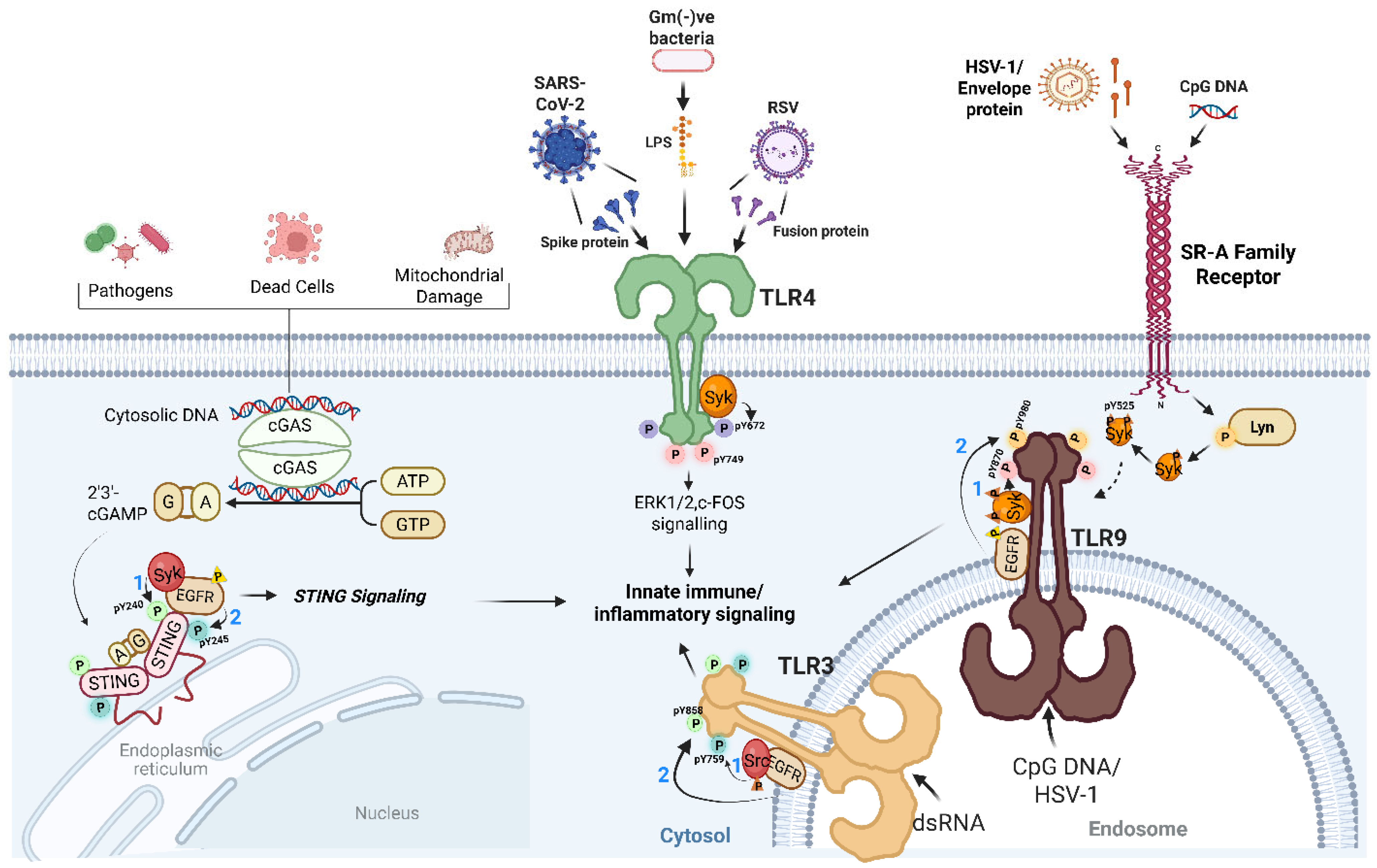 A growing body of evidence indicates that tyrosine phosphorylation is a common mechanism across multiple antiviral TLRs [7]. We showed that TLR3 requires Src and EGFR-dependent phosphorylation of its cytoplasmic domain, facilitating TRIF recruitment and IRF3 activation [8,9]. TLR4 signaling, in contrast, depends on EGFR for the IRF3-driven antiviral arm, but not for NF-κB-mediated inflammatory responses [10]. These studies suggest that EGFR acts as a nodal kinase, connecting diverse TLRs to specific transcriptional outcomes. Together, we uncover, through this series of studies, an emerging theme: tyrosine kinases function not only as regulators but also as activators that couple ligand sensing with receptor phosphorylation and downstream transcriptional programs. The phosphotyrosine-mediated regulation extends beyond TLRs to cytosolic DNA sensing by STING. STING activation, like TLR9, also requires sequential tyrosine phosphorylation of specific residues (Y240, Y245) by Syk and EGFR, which controls its trafficking from the ER to endosomes [11]. These modifications enable IRF3 activation and interferon (IFN) induction, underscoring how tyrosine phosphorylation integrates receptor activation with intracellular localization [12,13]. These findings, together with TLRs and STING, define a shared tyrosine kinase-dependent emerging paradigm that dictates the strength and localization of signaling responses.