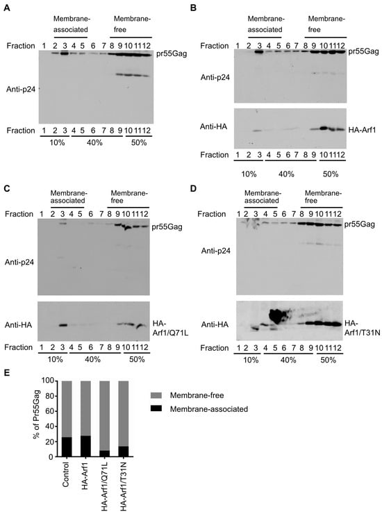 To determine whether Arf1 influences the membrane association of HIV-1 Gag, membrane flotation assays were performed using discontinuous iodixanol gradients. HEK 293T cells were co-transfected with plasmids encoding HIV-1 Gag and either empty vector (pcDNA3.1), WT HA-Arf1, HA-Arf1/Q71L, or HA-Arf1/T31N. At 48 h post-transfection, cells were harvested, lysed in hypotonic buffer, and post-nuclear supernatants were subjected to ultracentrifugation on 10–50% iodixanol step gradients. Twelve fractions were collected from top to bottom, corresponding to low-density (membrane-associated) and high-density (cytosolic or membrane-free) components, and analyzed by immunoblotting using anti-p24 to detect Gag and anti-HA to detect Arf1 variants.