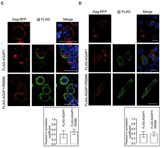 Figure 3D). Colocalization between Gag-RFP and AGAP1 constructs remained low and comparable (Pearson’s