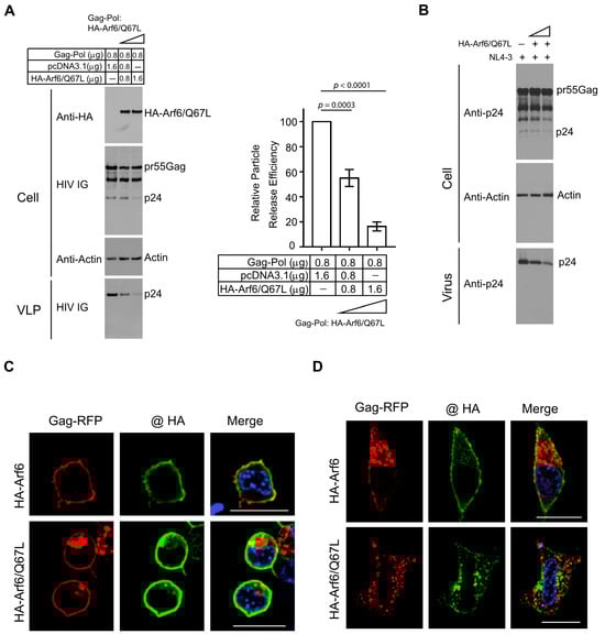 Figure 4A, right). A similar inhibitory effect of HA-Arf6/Q67L on virus release was observed in HEK 293T cells transfected with HIV-1 NL4-3 (