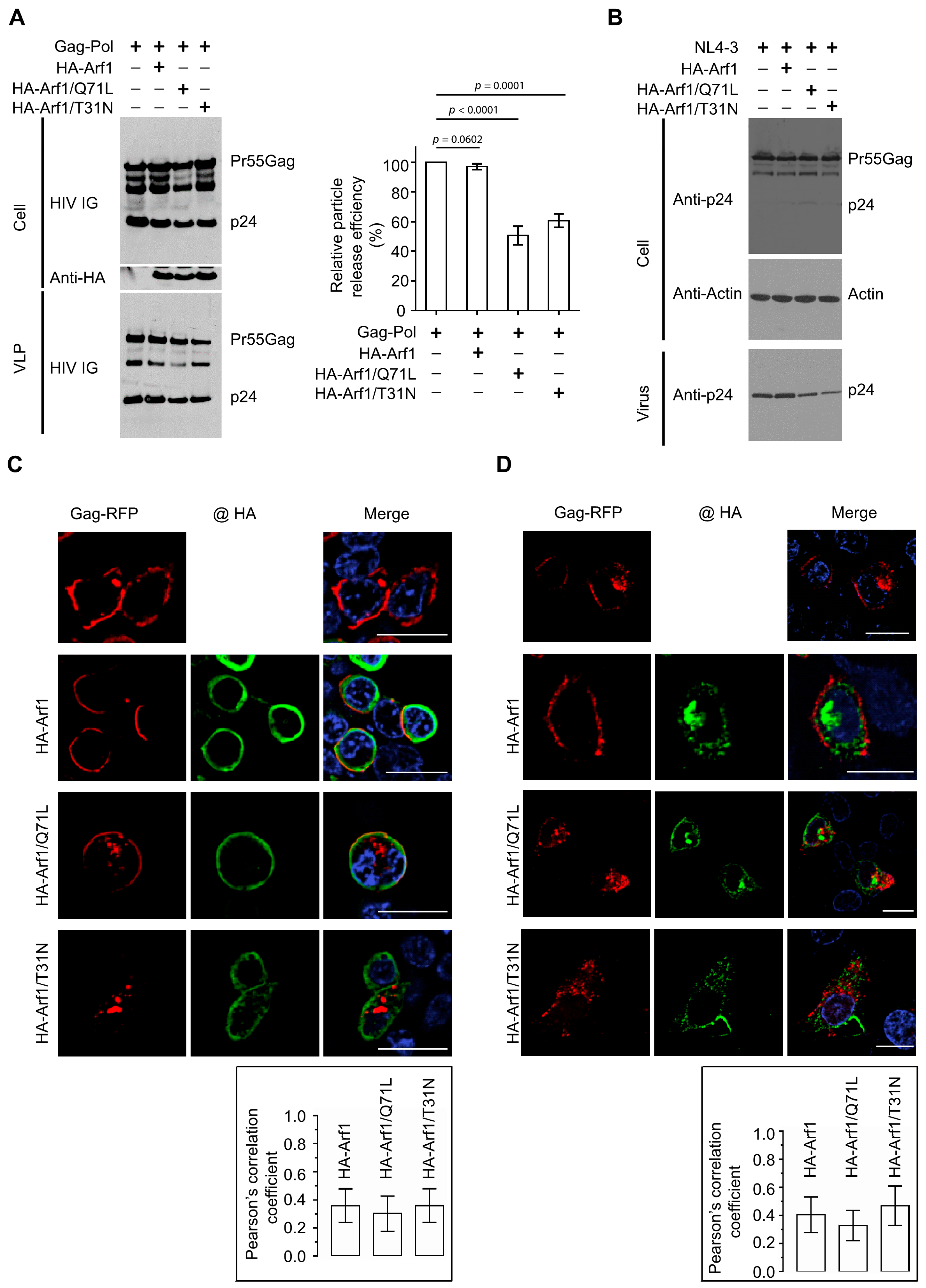 Figure 1A, right). These data suggest that both impaired GTP hydrolysis (Q71L) and defective GTP loading (T31N) compromise Arf1 function during HIV-1 assembly and/or release.