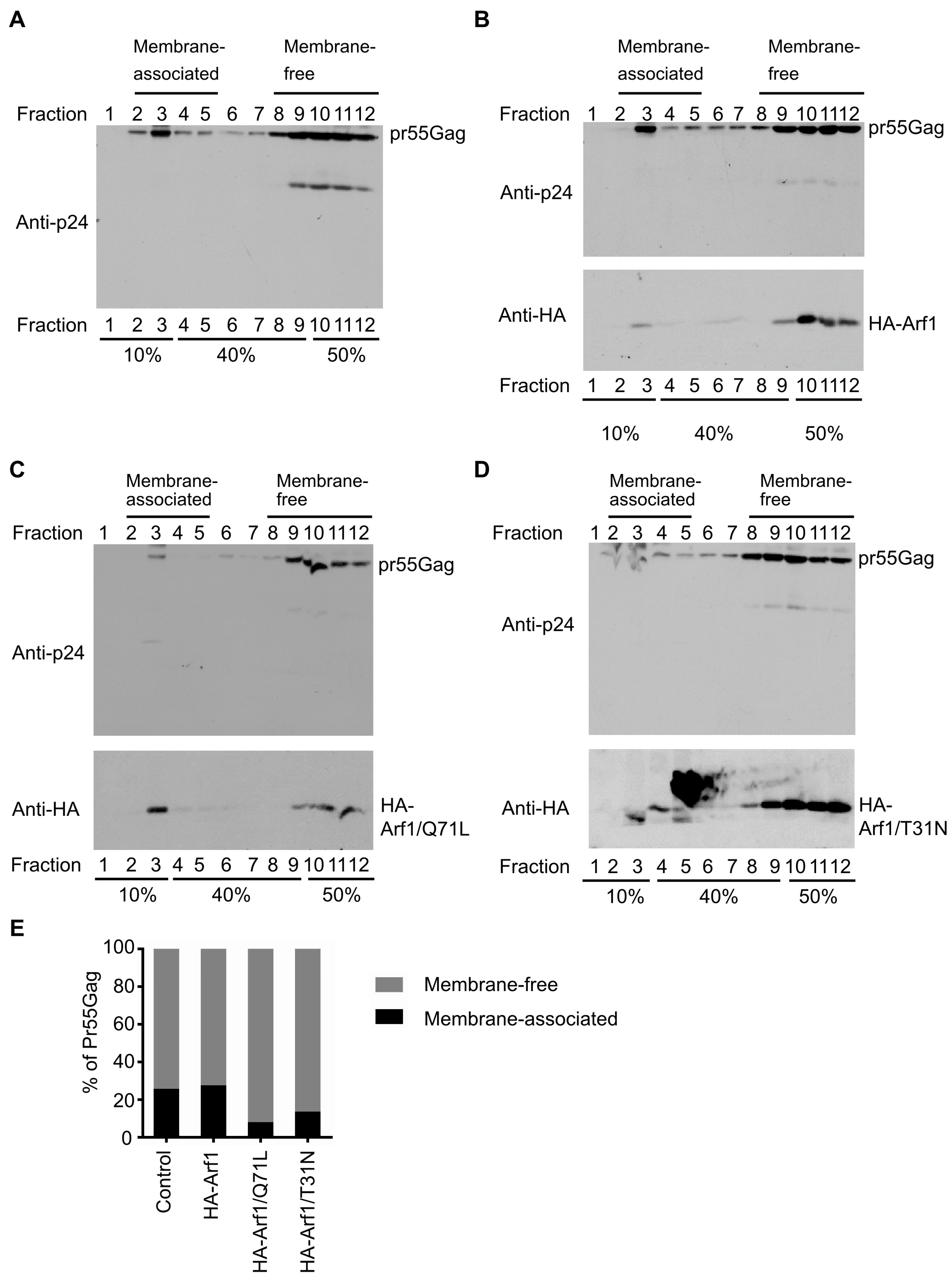 Figure 2B). In contrast, expression of either HA-Arf1/Q71L or HA-Arf1/T31N caused a pronounced shift of Gag from membrane-associated fractions to denser fractions (