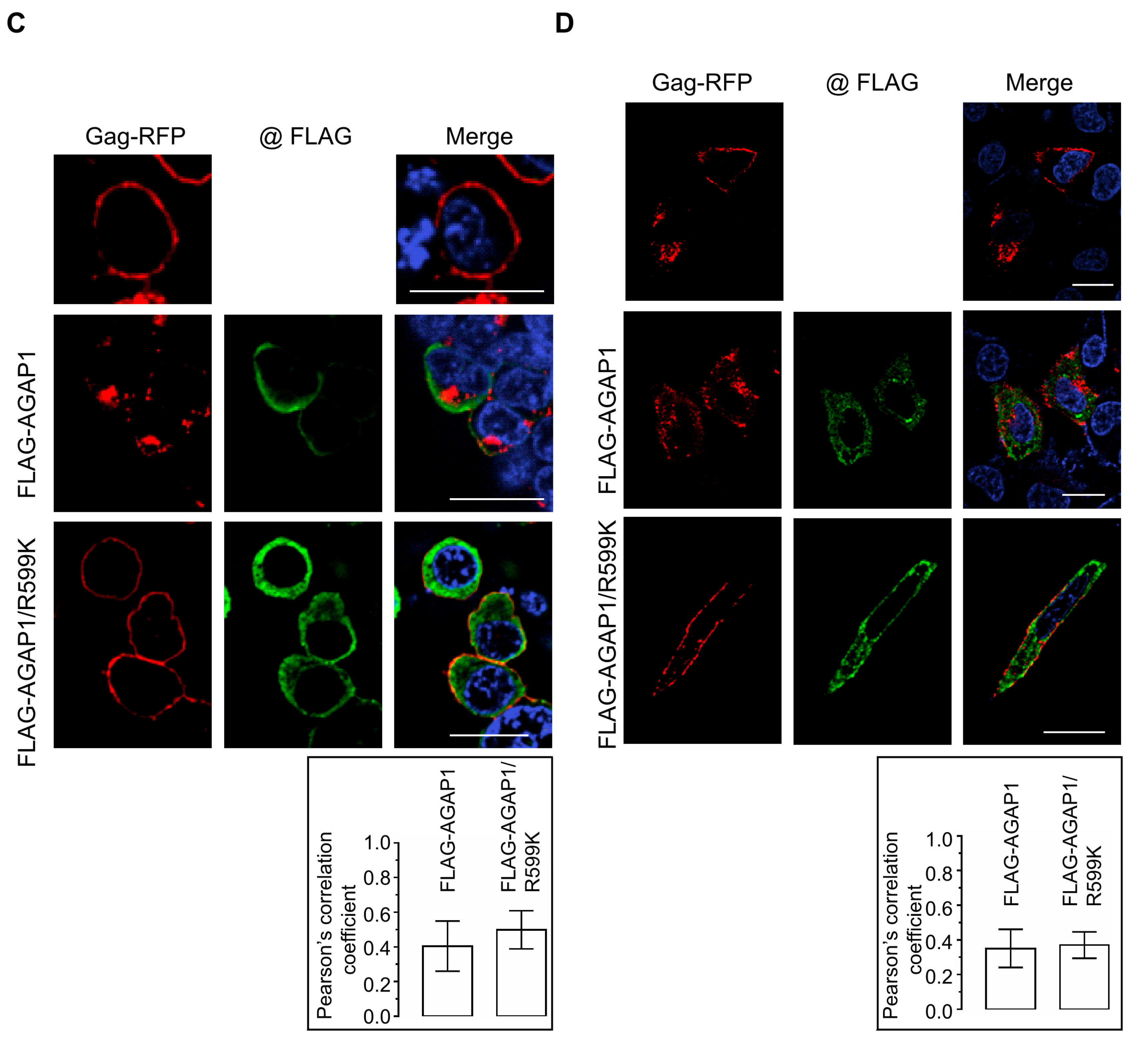 R: 0.40 ± 0.14 for WT, 0.49 ± 0.10 for R599K). Similar results were obtained in HeLa cells: WT AGAP1 disrupted Gag-RFP localization to the plasma membrane, whereas AGAP1/R599K had minimal effect (