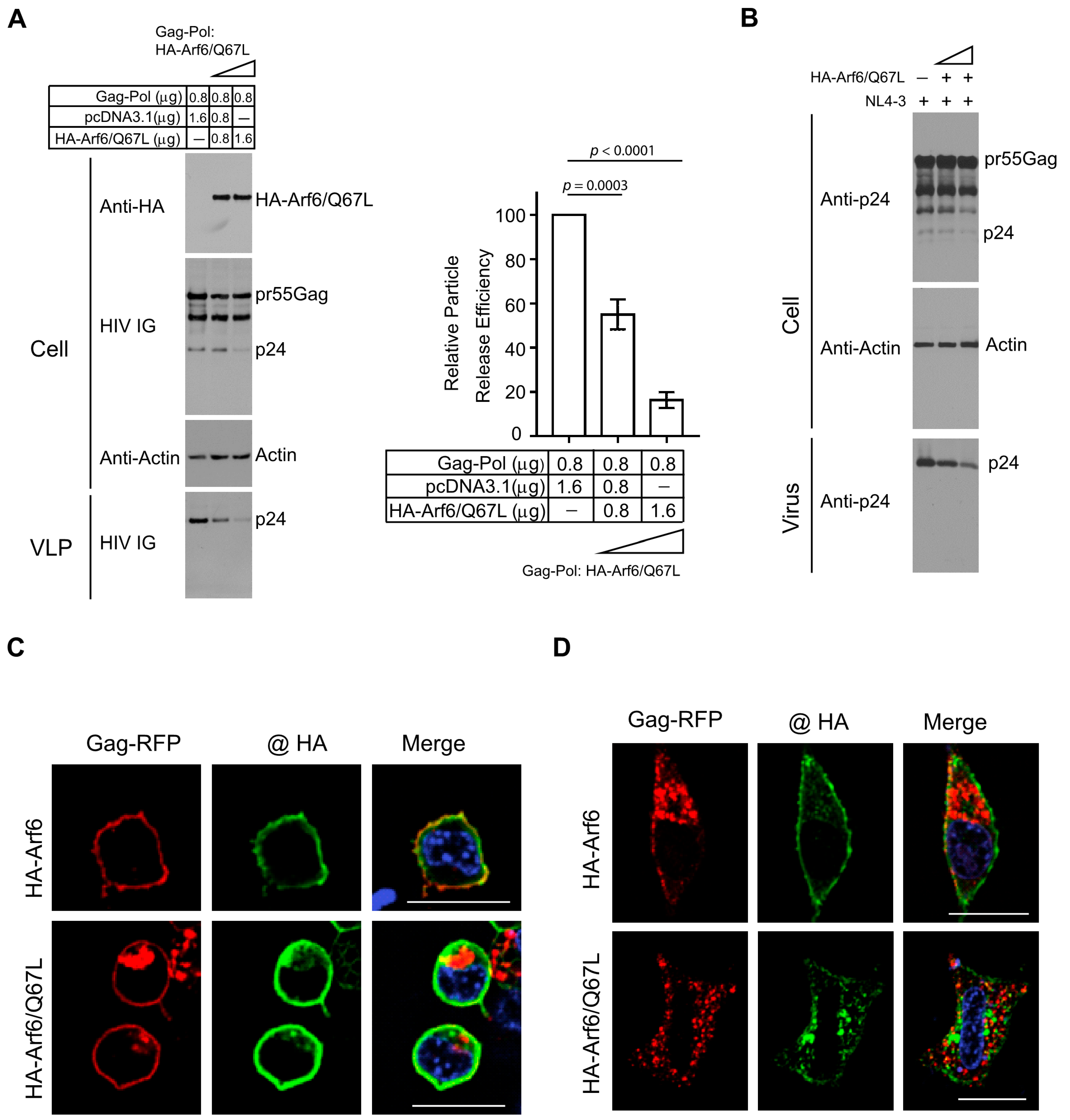 Figure 4D). Parallel experiments using untagged Gag confirmed that Arf6/Q67L expression impaired Gag trafficking to the plasma membrane (