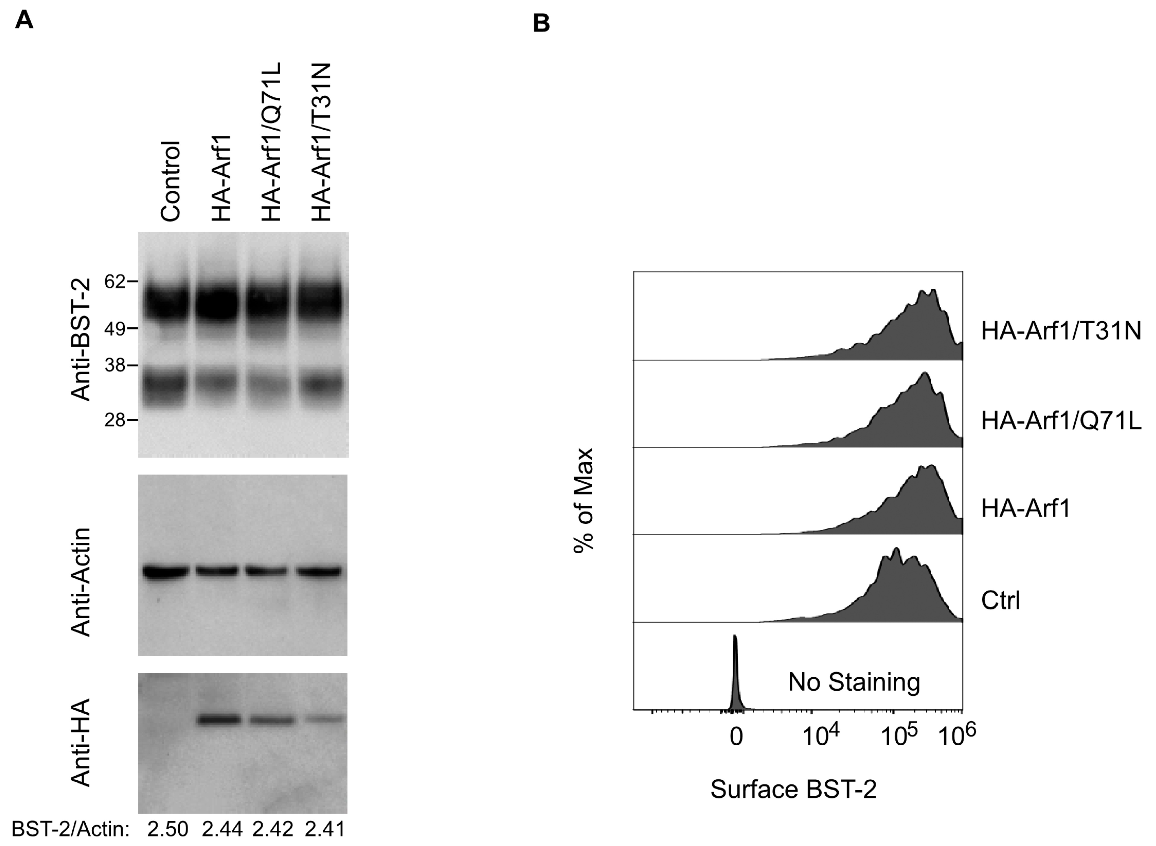 Figure 6A). Flow cytometric analysis of GFP-positive cells co-transfected with Arf1 constructs confirmed that surface BST-2 expression remained comparable to empty vector controls (