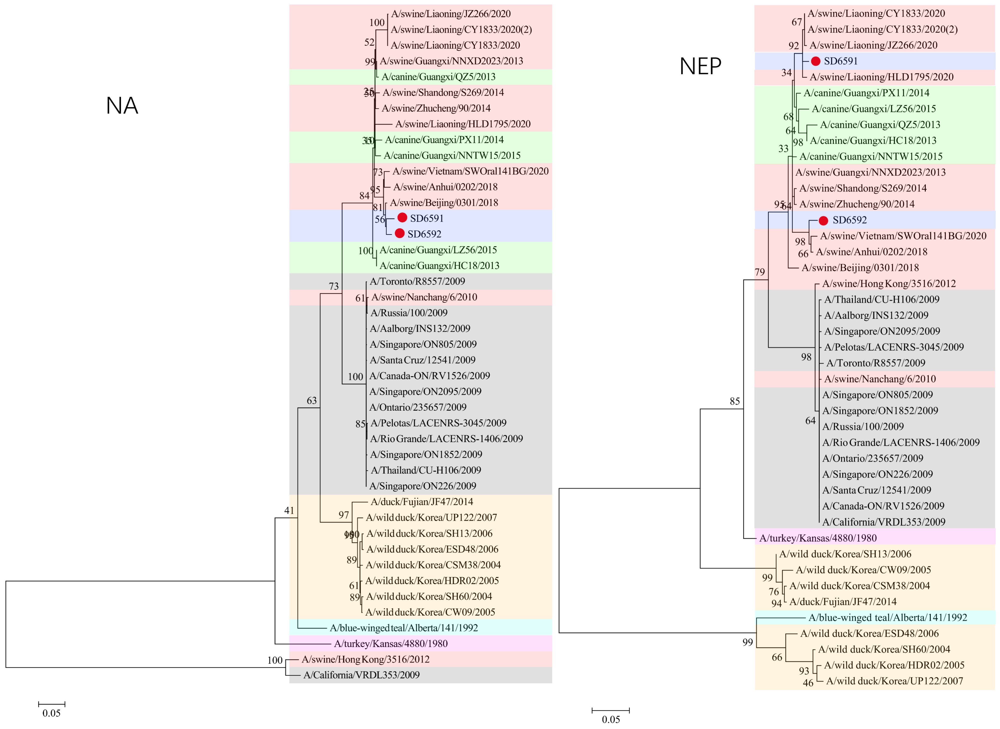 | NA | A/swine/China/Qingdao/2018(H1N1) | MK587716 | 91.06% |