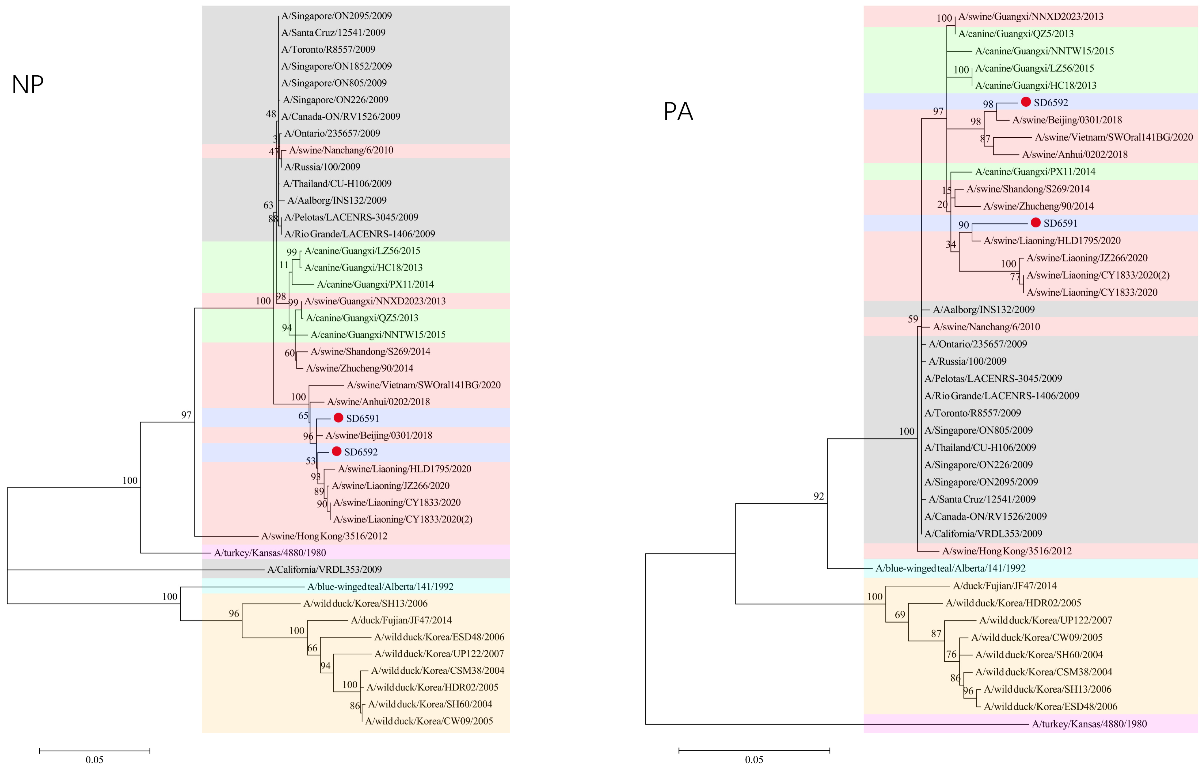 | PA | A/swine/China/Qingdao/2018(H1N1) | MK587713 | 97.79% |
