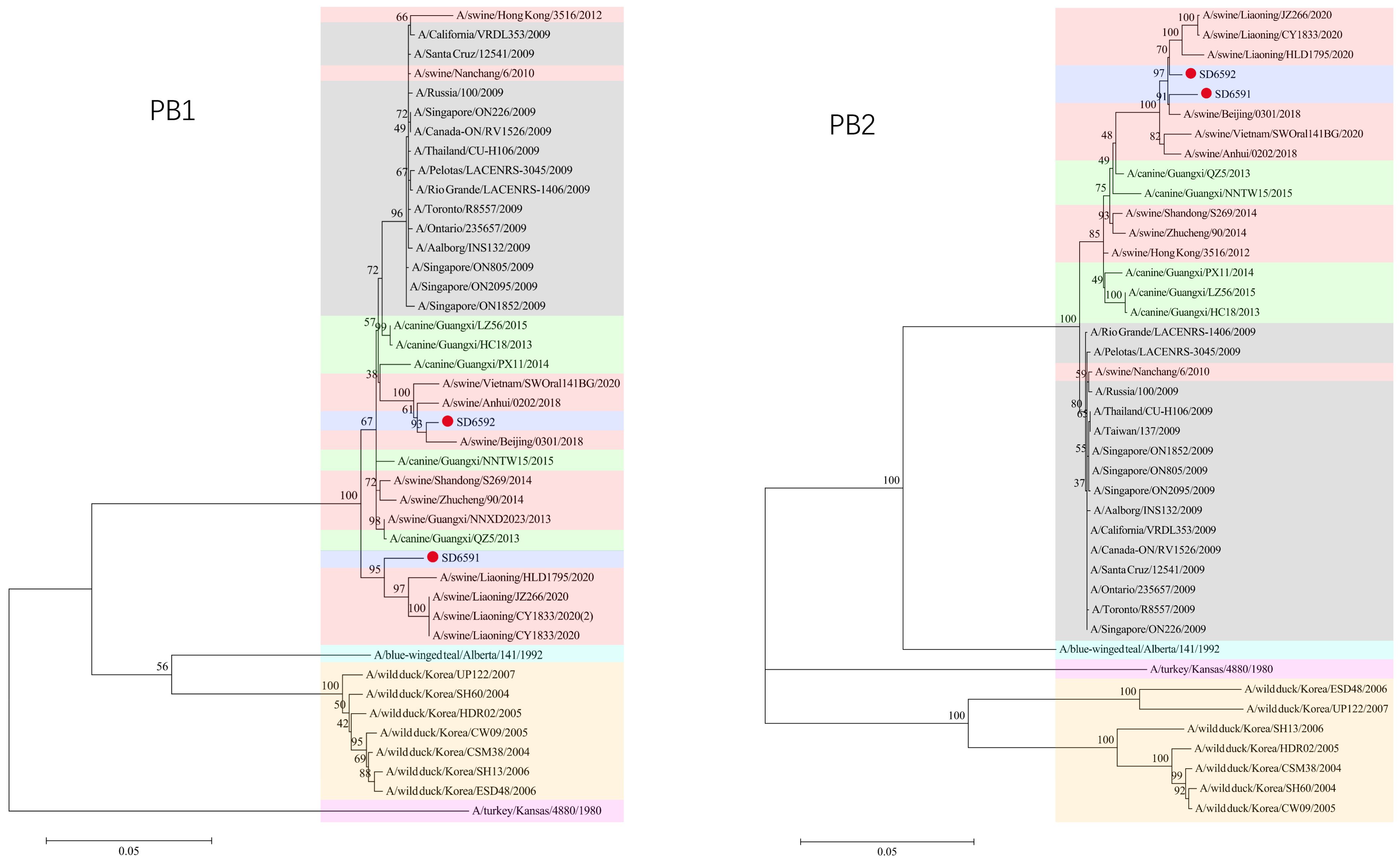 | PB2 | A/swine/China/Qingdao/2018(H1N1) | MK587711 | 94.37% |