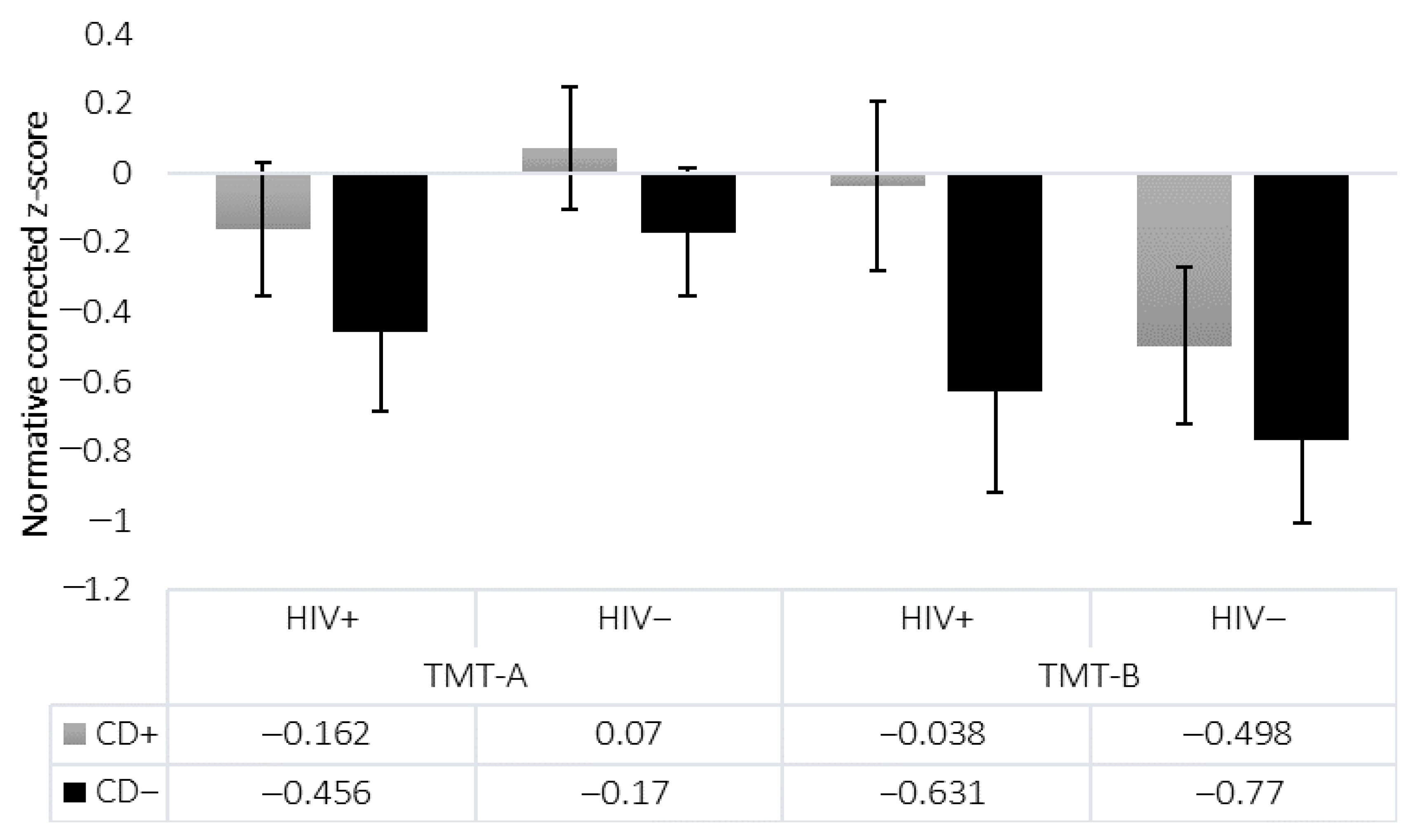 - Martínez-Banfi, M.; Vélez, J.I.; Perea, M.V.; García, R.; Puentes-Rozo, P.J.; Mebarak Chams, M.; Ladera, V. Neuropsychological performance in patients with asymptomatic HIV-1 infection. AIDS Care 2018, 30, 623–633. [Google Scholar] [CrossRef] [PubMed]