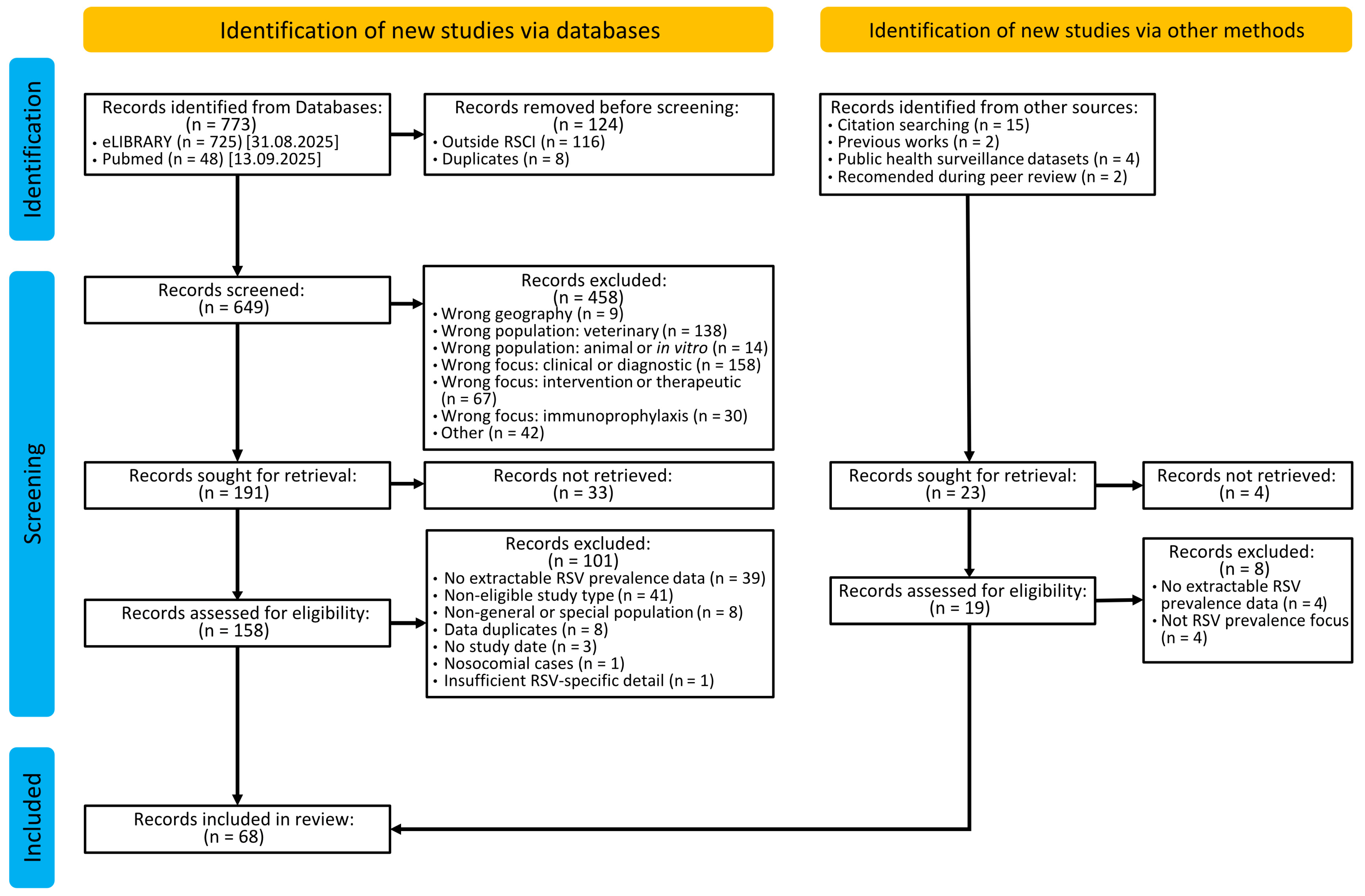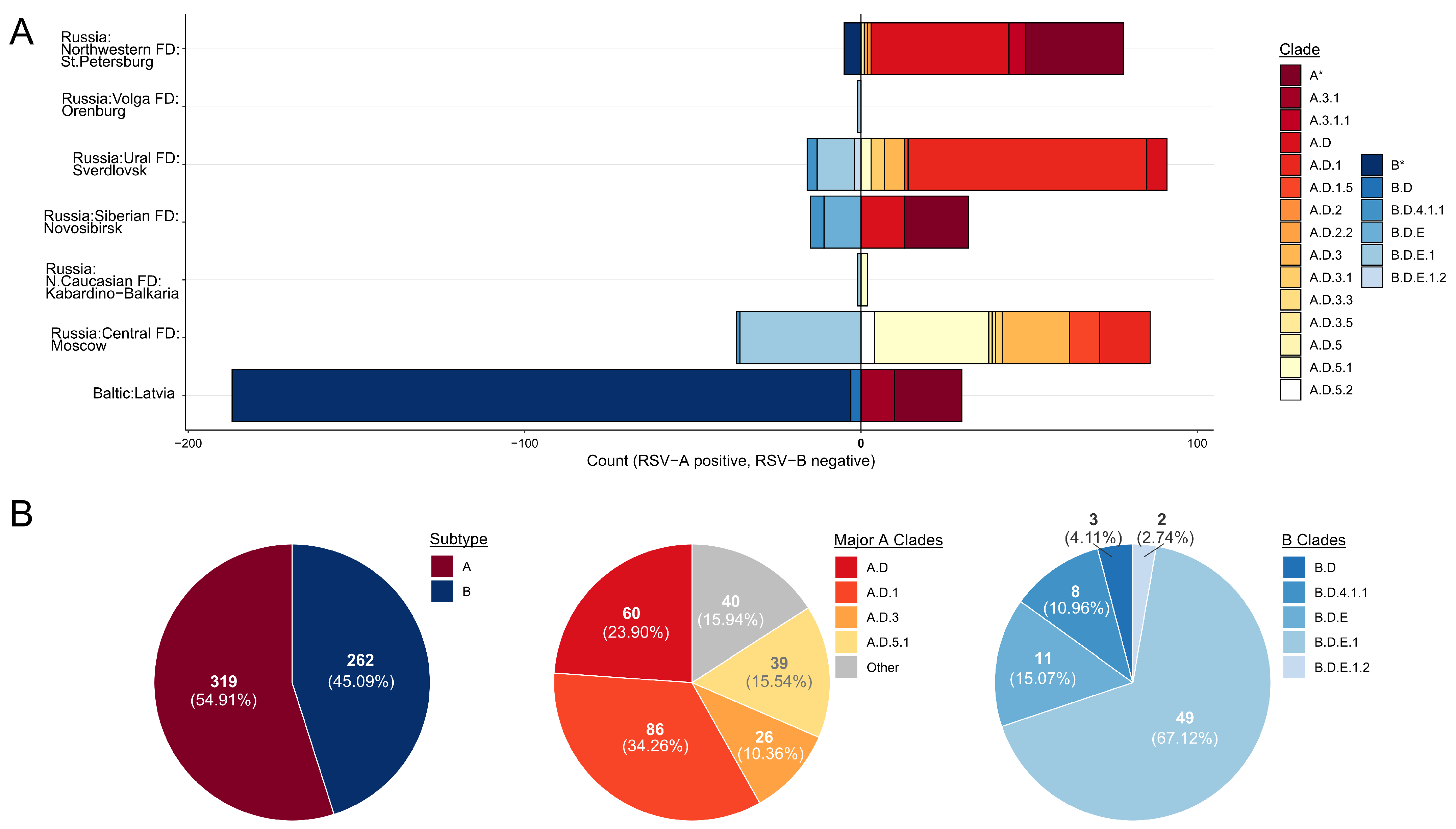- Yatsyshina, S.B.; Mamoshina, M.V.; Elkina, M.A.; Streltsova, S.Y.; Bulanenko, V.P.; Pika, M.I.; Akimkin, V.G. Analysis of the Prevalence and Genetic Diversity of Human Respiratory Syncytial Virus in the Period from 2021 to 2024. Èpidemiol. Infekc. Bolezn. Aktual. Vopr. 2025, 15, 90–97. [Google Scholar] [CrossRef]