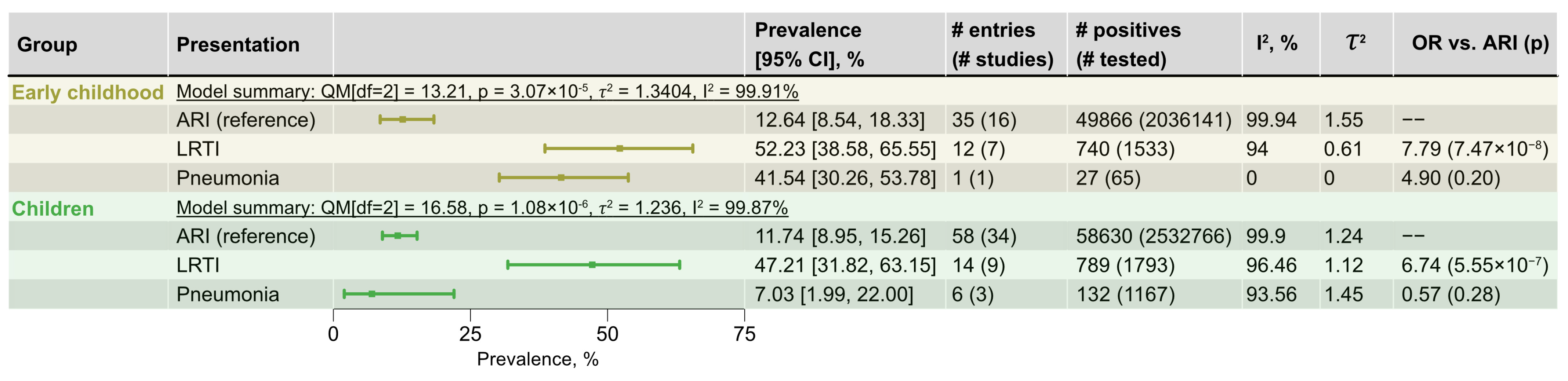 - Wang, X.; Li, Y.; Mei, X.; Bushe, E.; Campbell, H.; Nair, H. Global Hospital Admissions and In-Hospital Mortality Associated with All-Cause and Virus-Specific Acute Lower Respiratory Infections in Children and Adolescents Aged 5–19 Years between 1995 and 2019: A Systematic Review and Modelling Study. BMJ Glob. Health 2021, 6, e006014. [Google Scholar] [CrossRef]