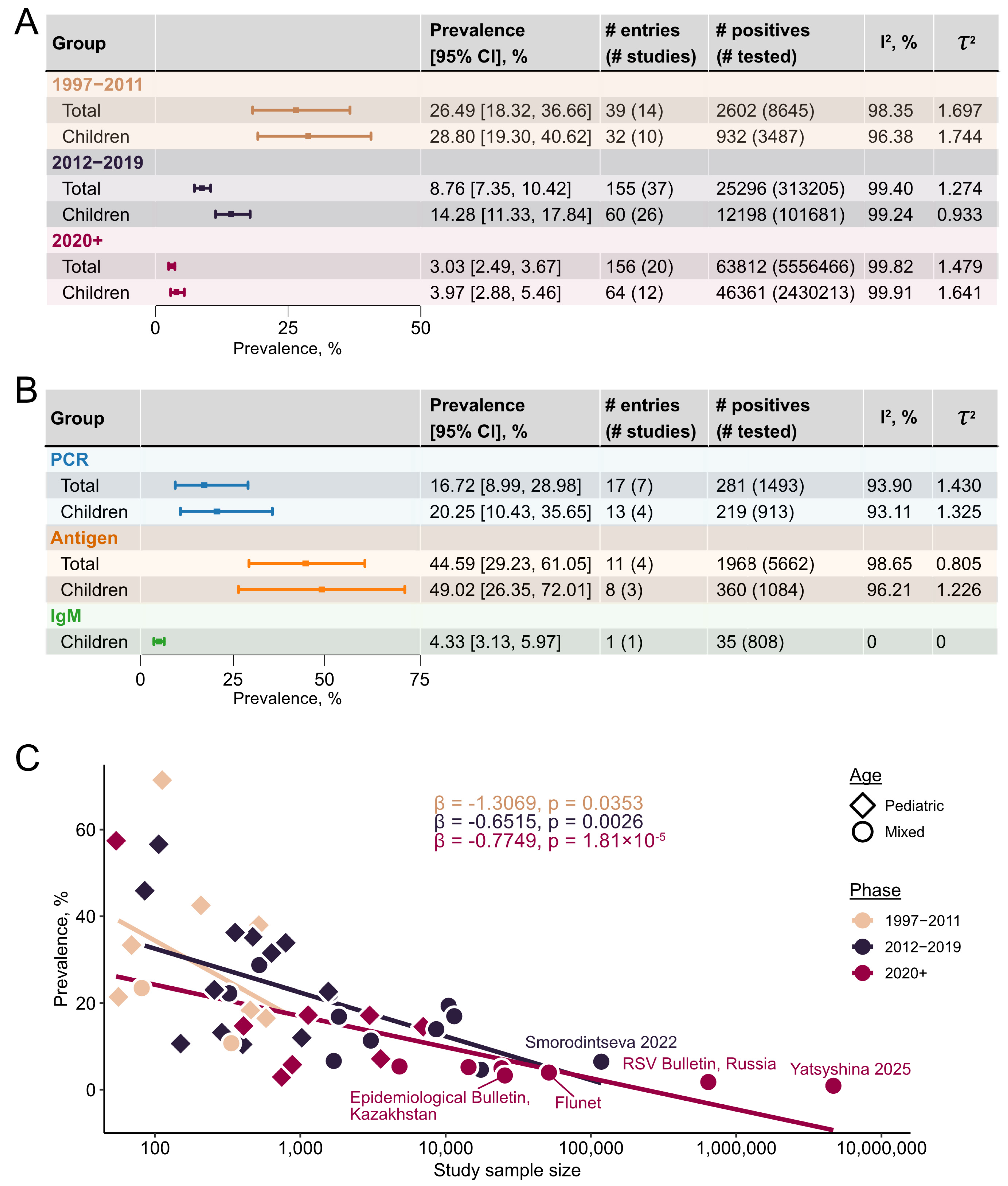 Maslov, D.E.; Osipov, I.D.; Zabelina, D.S.; Pak, A.A.; Netesov, S.V. Respiratory Syncytial Virus Prevalence and Genotypic Distribution in the Countries of the Former Soviet Union: A Systematic Review and Meta-Analysis. Viruses 2026, 18, 126. https://doi.org/10.3390/v18010126