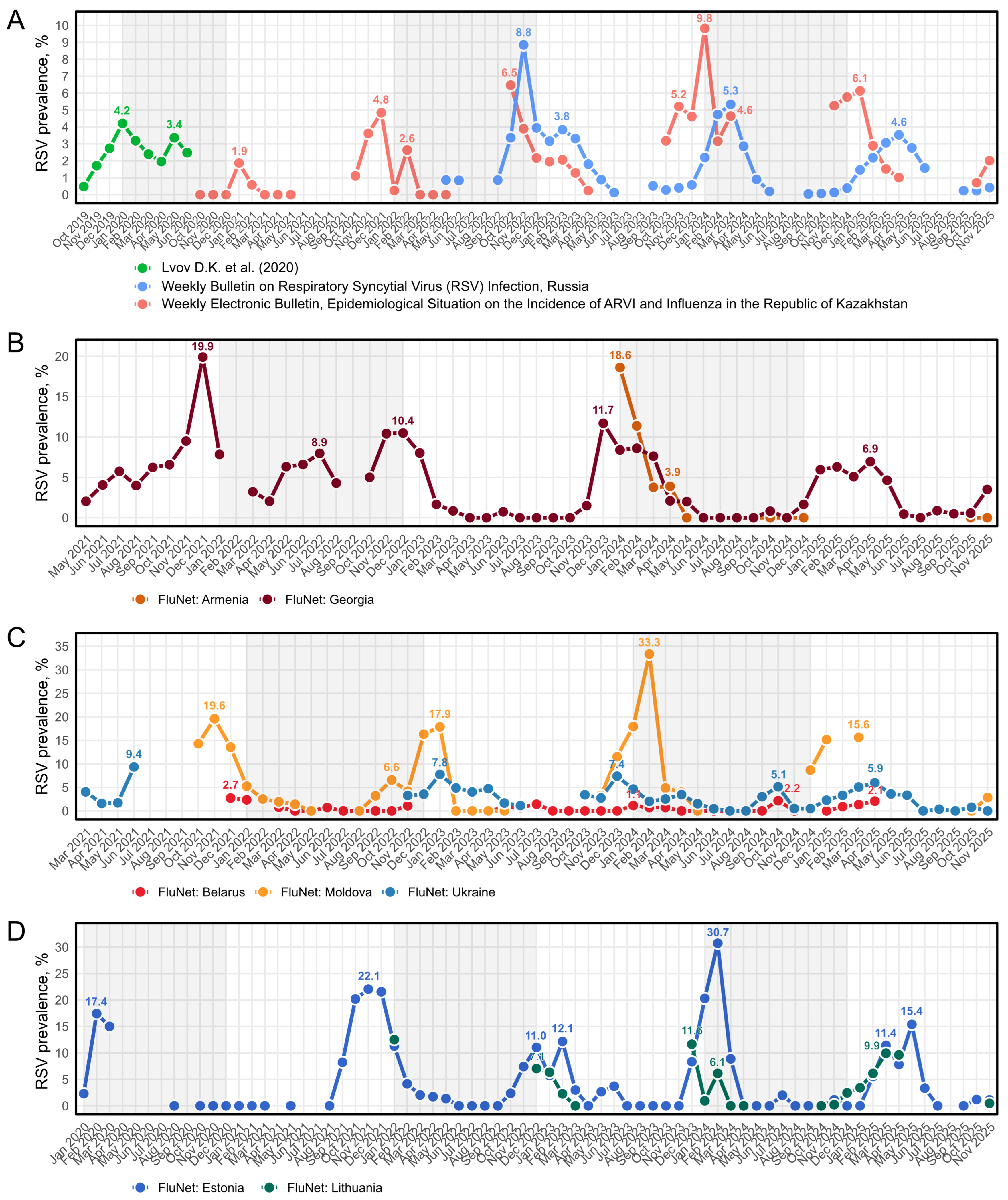 | WHO FluNet | 2020–2025 | 2020–2025 | Mixed | In and out | Armenia, Georgia, Moldova, Uzbekistan, Turkmenistan, Kyrgyzstan, Ukraine, Belarus, Estonia, Latvia, Lithuania | ARI | [22] |