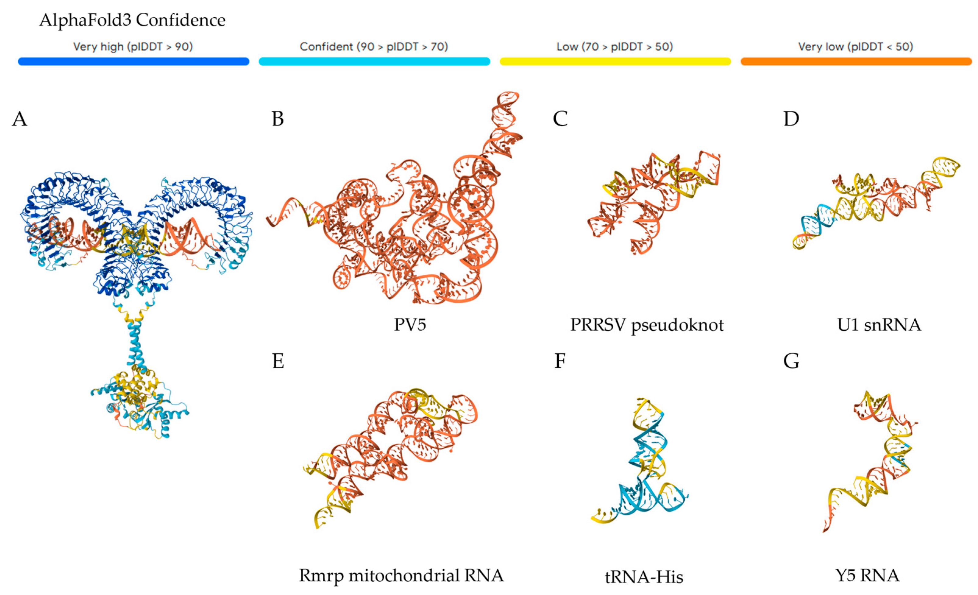 - Bernard, C.; Postic, G.; Ghannay, S.; Tahi, F. Has AlphaFold3 Achieved Success for RNA? Acta Crystallogr. Sect. D Struct. Biol. 2025, 81, 49–62. [Google Scholar] [CrossRef] [PubMed]
