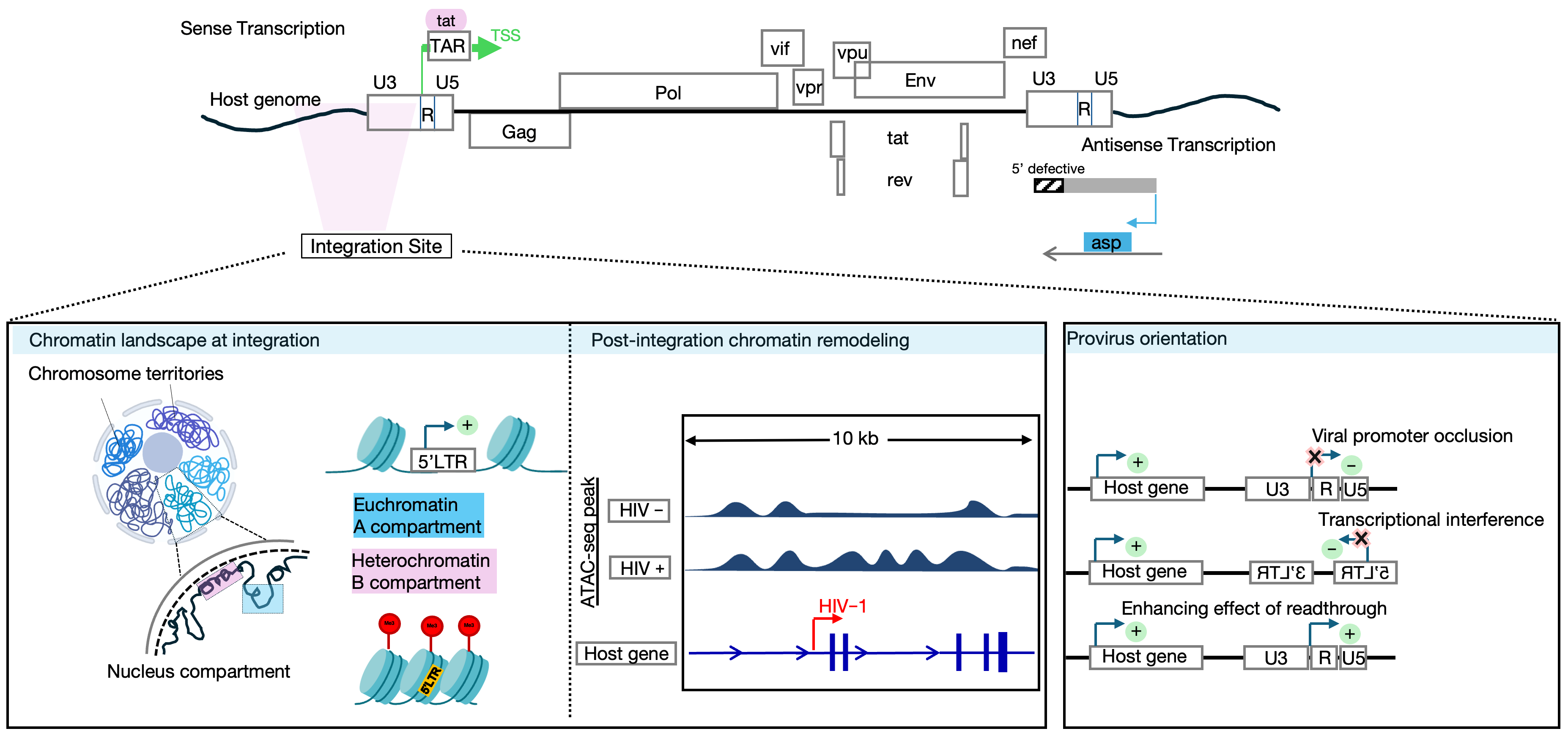 | CTCF binding site | Intragenic single CTCF binding site | Provirus itself lacks a CTCF site, but CTCF enriched in the surrounding chromatin of latent cells |