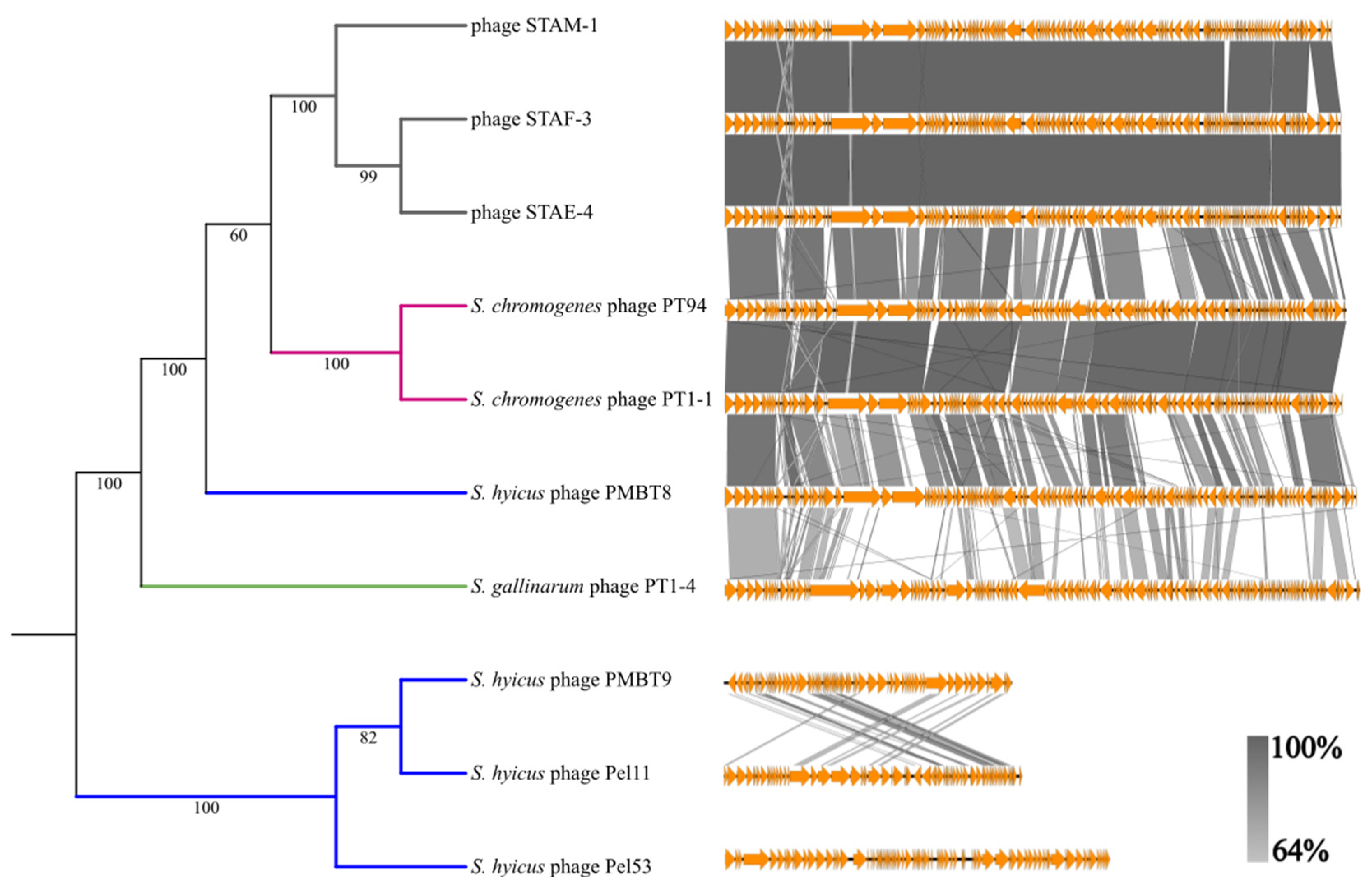 Figure 3. A comparison of the phage genomes analysed in this study. A Cluster dendrogram of the phage genomes based on the percentage of conserved protein matrix is shown on the left. The colors of the branches represent the host species of phages: Staphylococcus hyicus (blue), Staphylococcus chromogenes (pink), and Staphylococcus gallinarum (green). Bootstrap values are indicated for each branch. tBLASTx comparisons of the phage genomes visualized with Easyfig are shown on the right. Each genome is represented on a different line according to their position on the cluster dendrogram. Orange arrows represent coding sequences. Vertical blocks between genomes indicate regions of shared similarity according to the tBLASTx analysis and are colored based on percentage of similarity: from low similarity (light grey) to high similarity (dark grey).