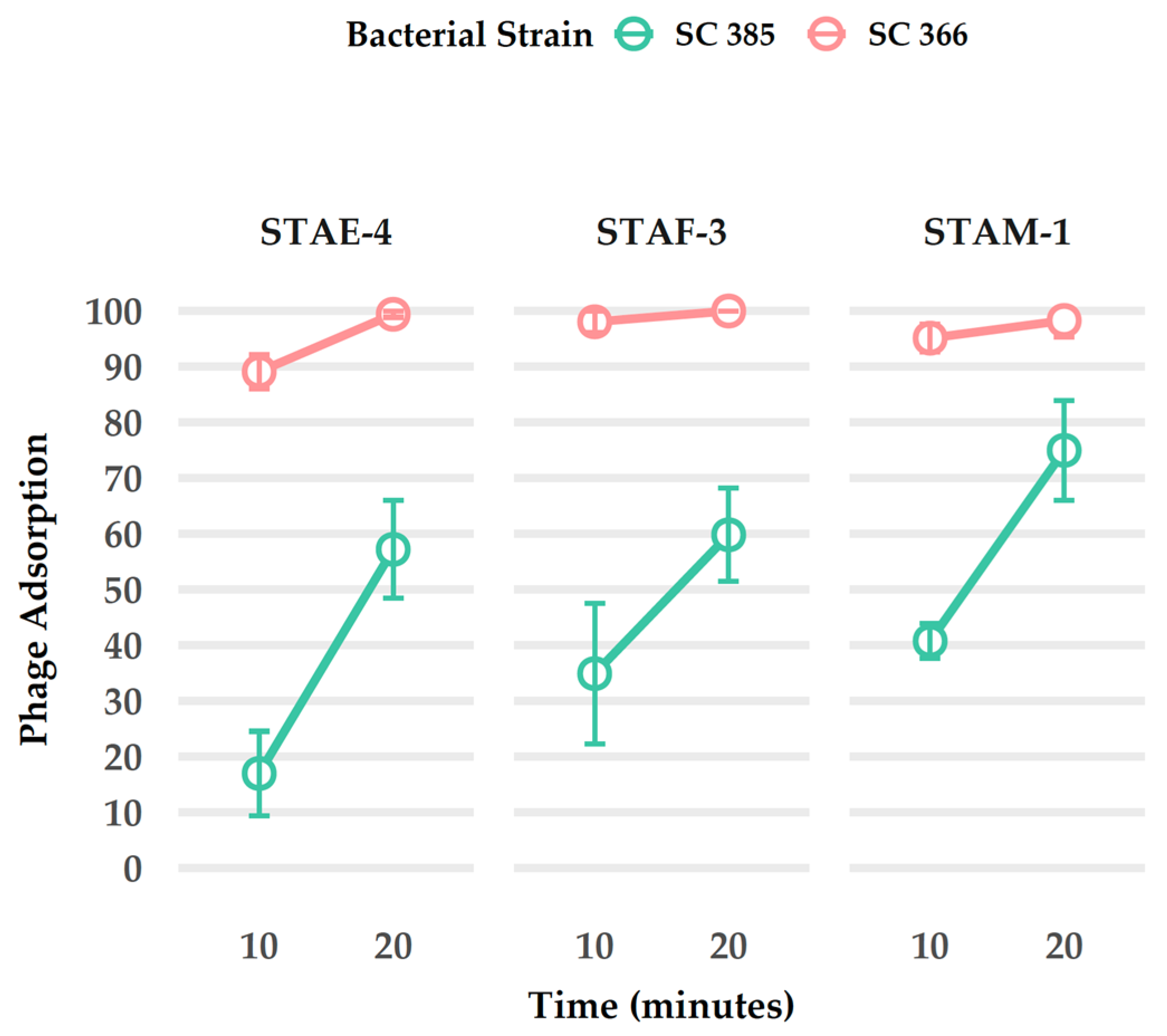 Figure 6. Adsorption dynamics of phages STAE-4, STAF-3, and STAM-1 on two bacterial strains, SC385 and SC366, at 10 and 20 min. Adsorption efficiency was calculated by comparing the number of lysis plaques before and after adsorption for each time point using TSA top agar plates. Each experiment was conducted with a minimum of three biological replicates, each including three technical replicates.